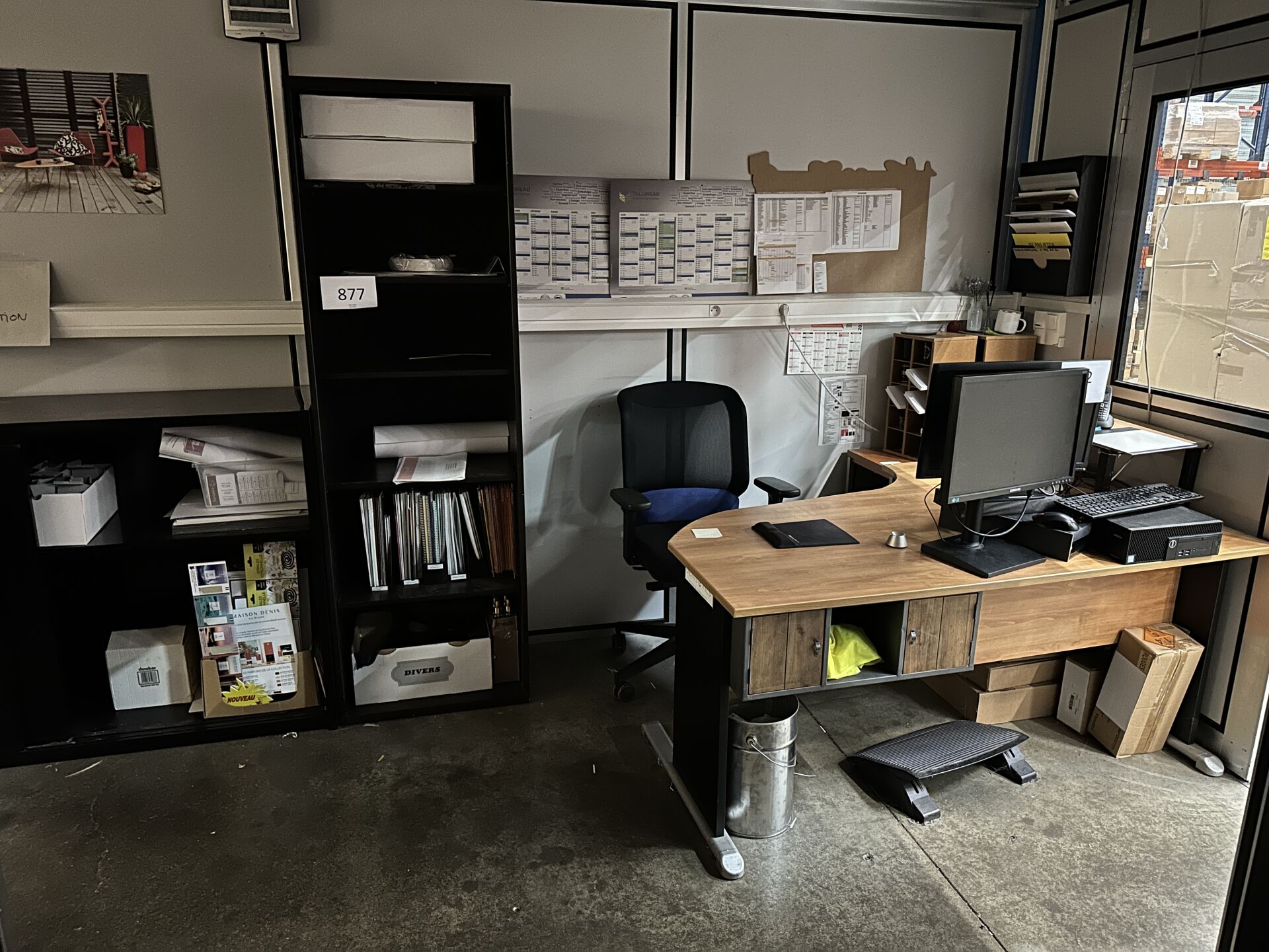 4 bureaux mélaminé gris et façon bois 220 x 150 cm + 1 bureau bois clair 140 x 80 cm