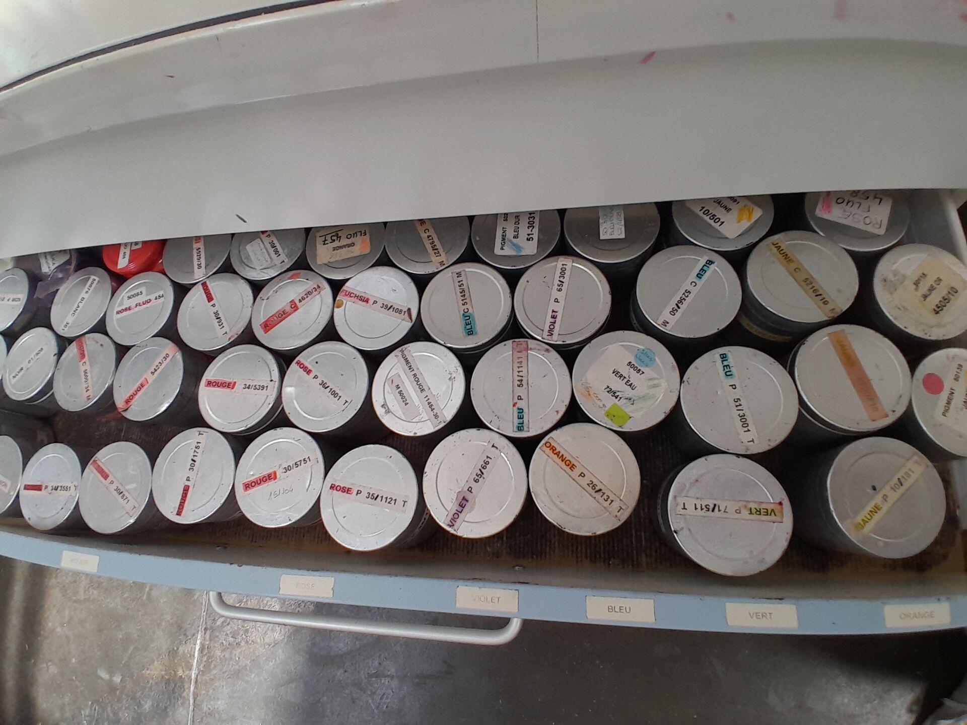 Dans 8 tiroirs , 1 stock de pigments de couleur en pots métal , environ 200 unités