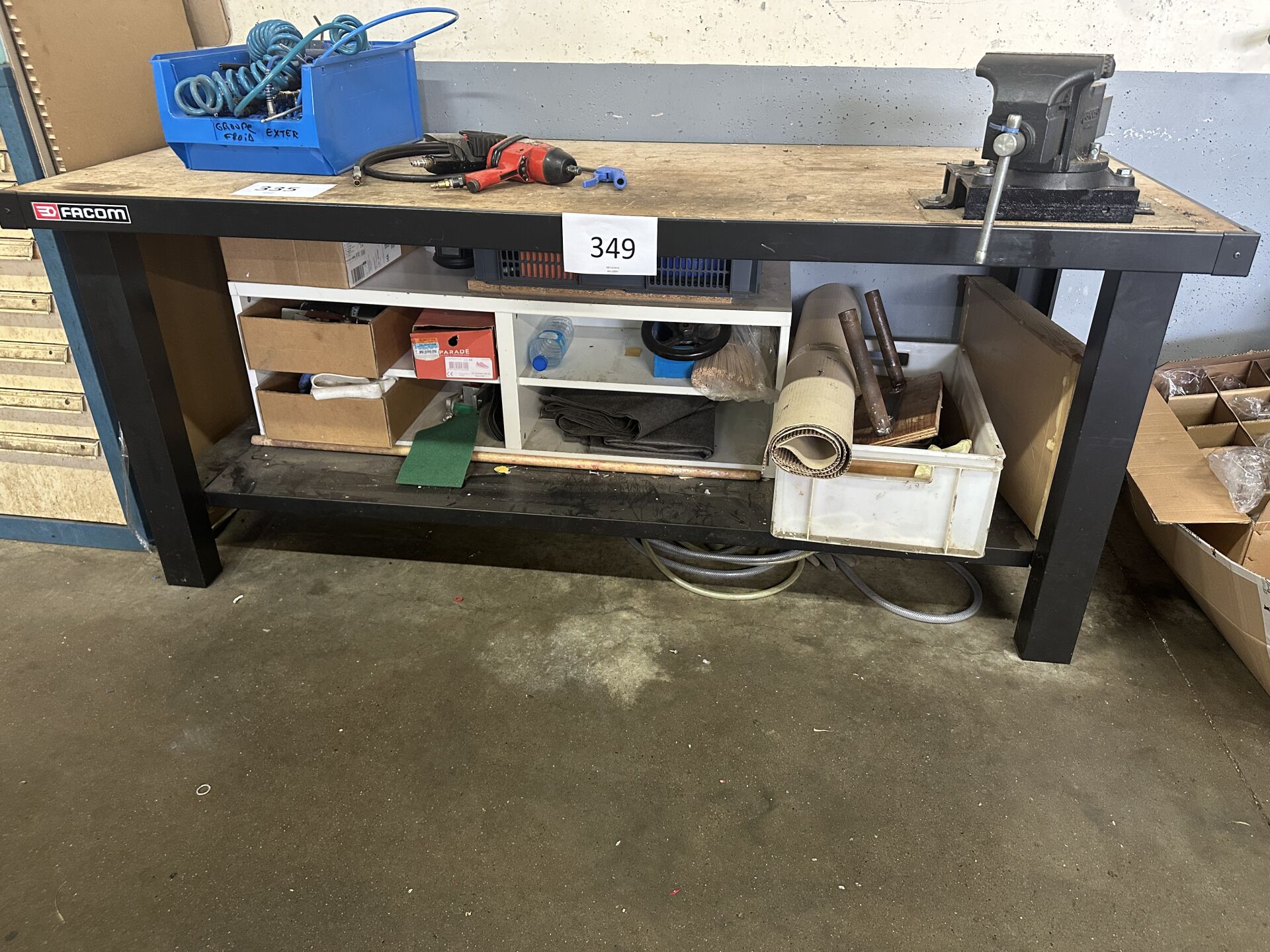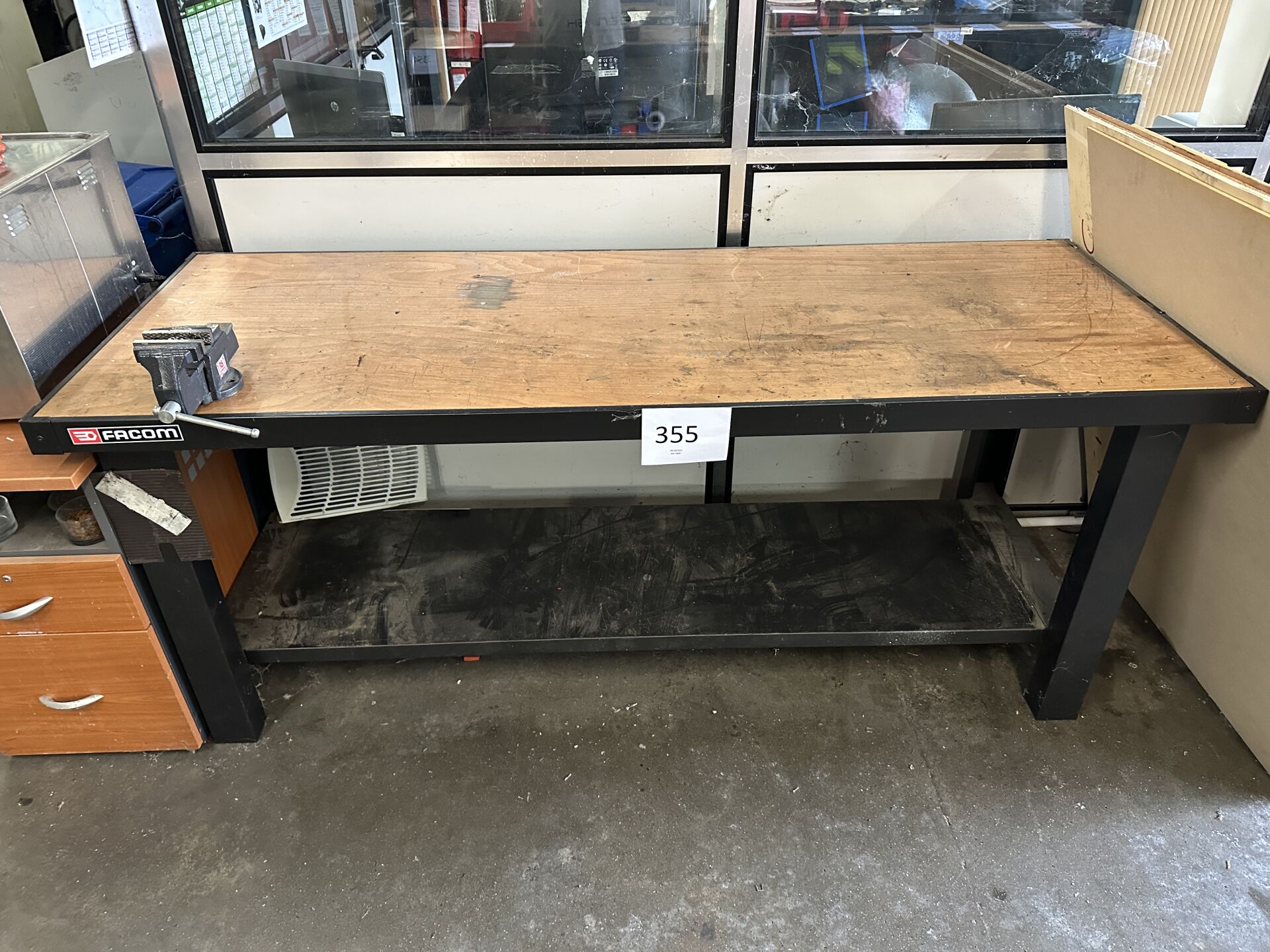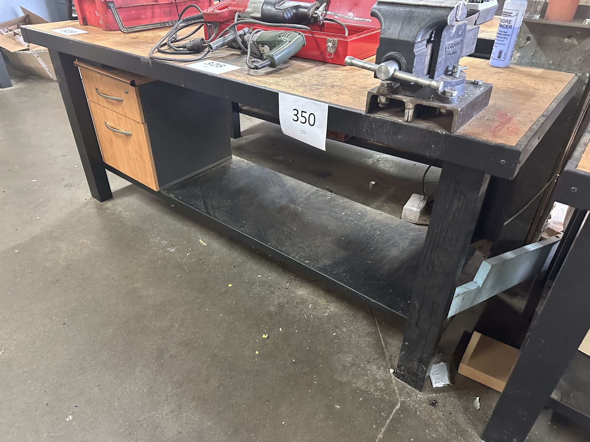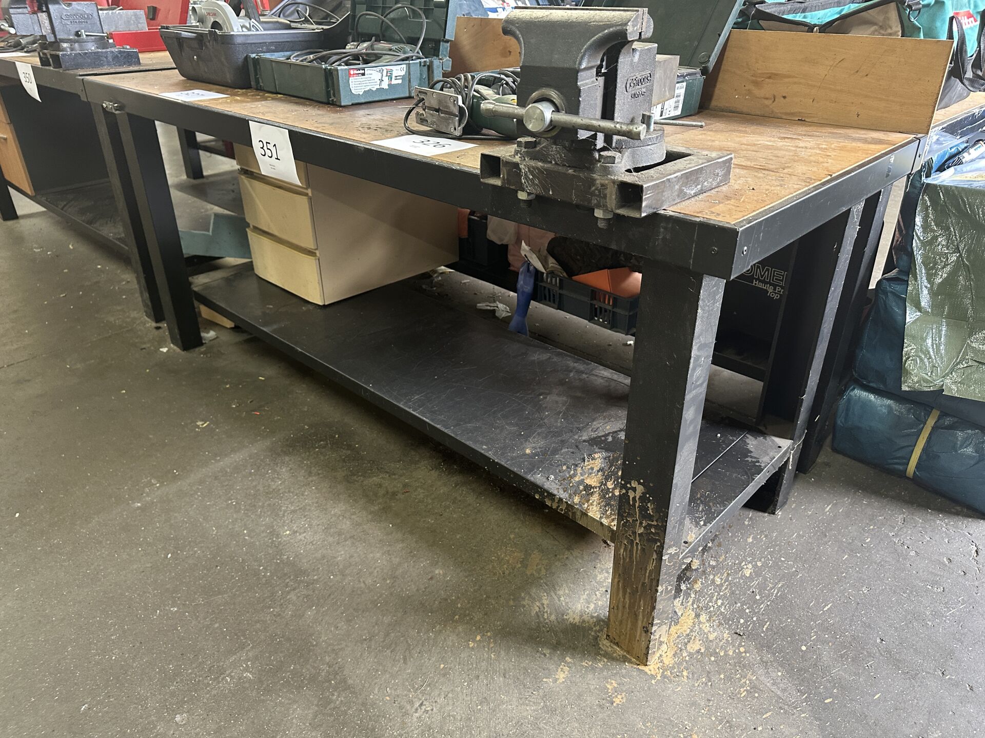1 établi plateau bois piètement métal 2 tiroirs état moyen équipé de 2 étaux mors...