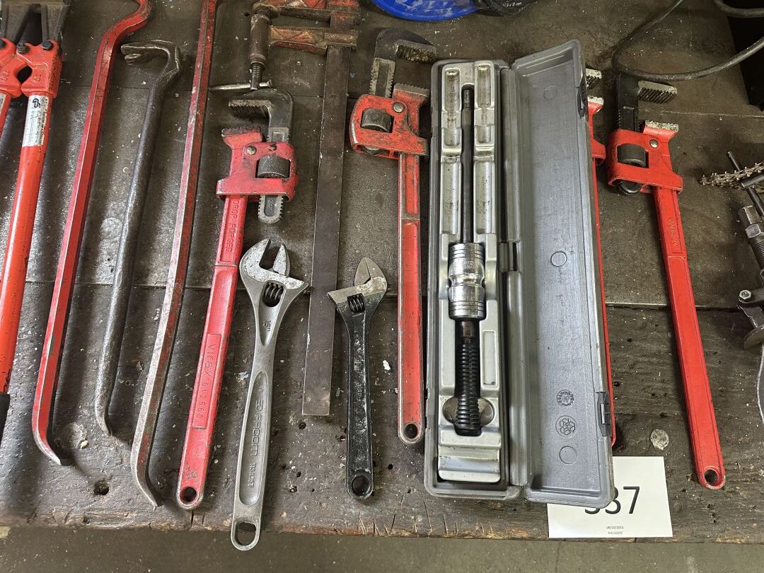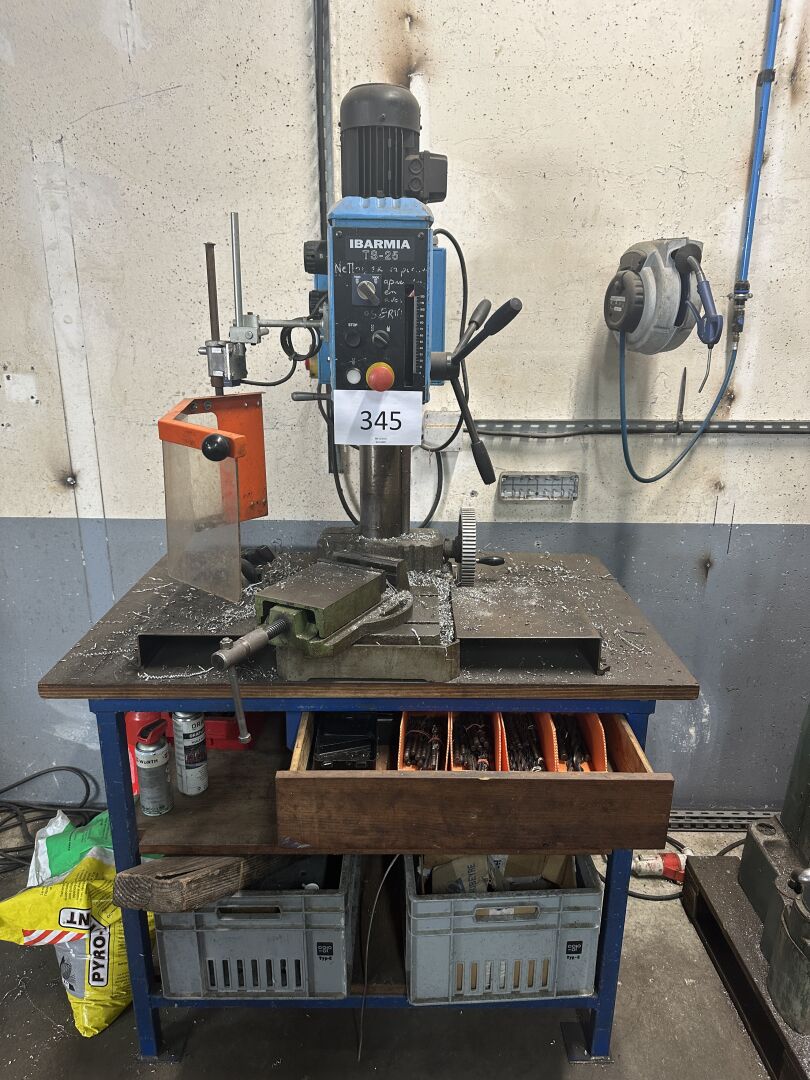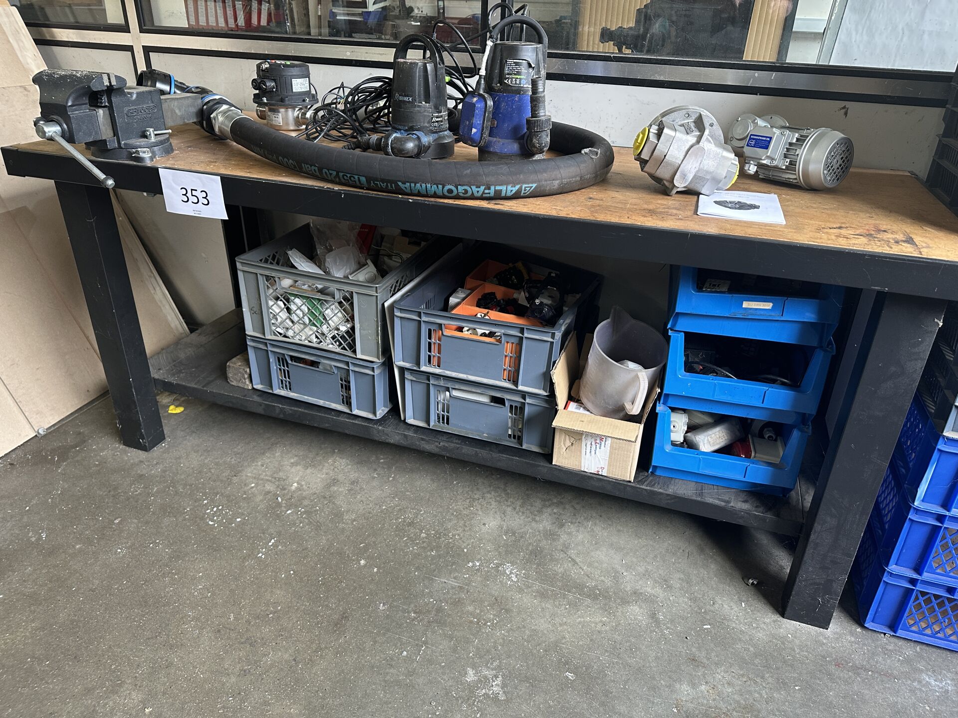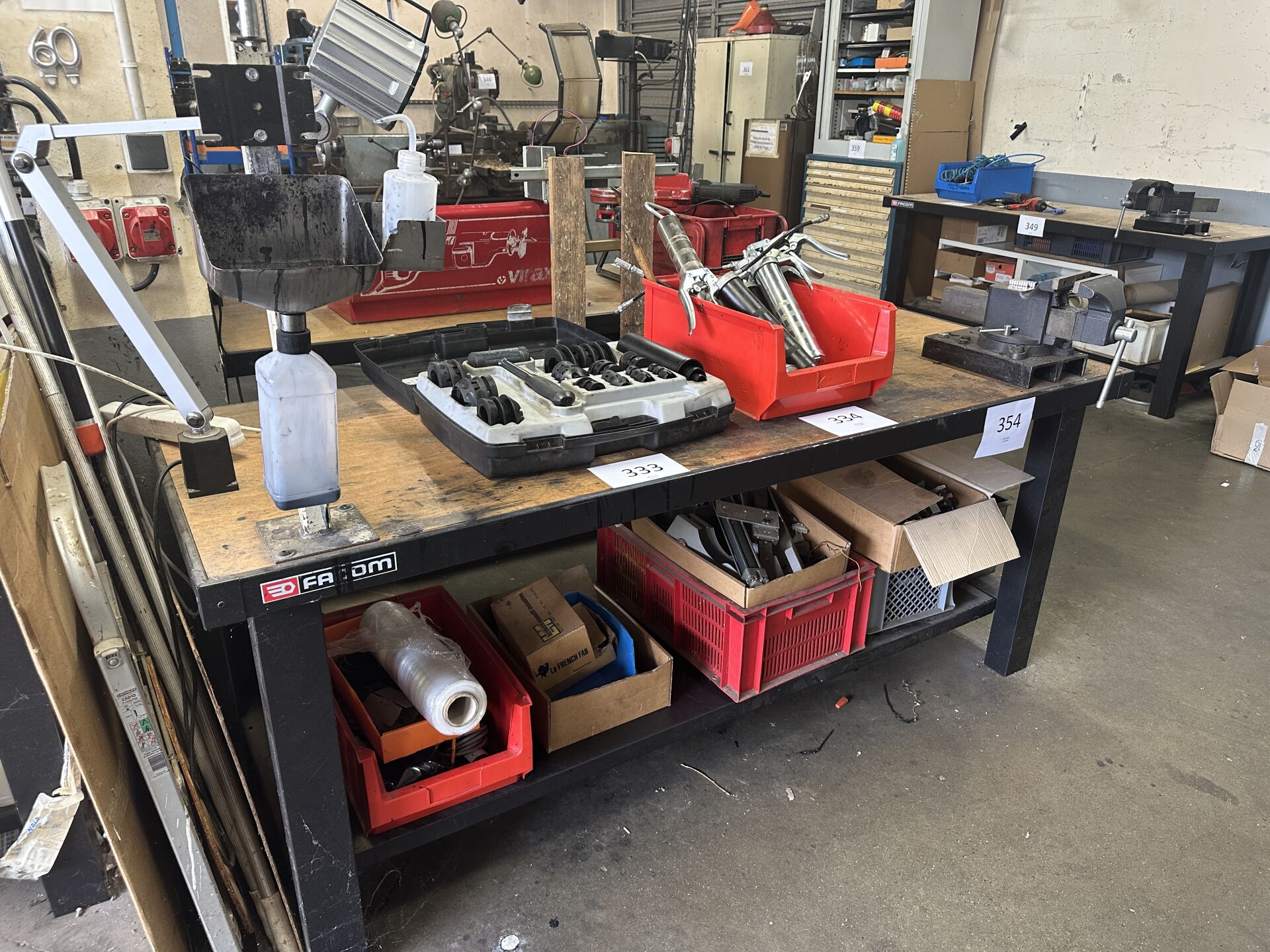 1 établi plateau bois piètement métal 2 tiroirs état moyen équipé de 2 étaux mors...