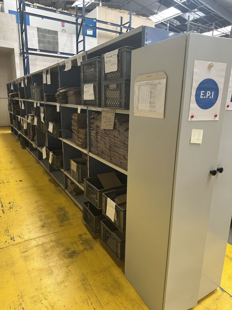 10 modules d’étagères métal gris et métal bleu (95 x 51 x 198 cm) + 2 modules...