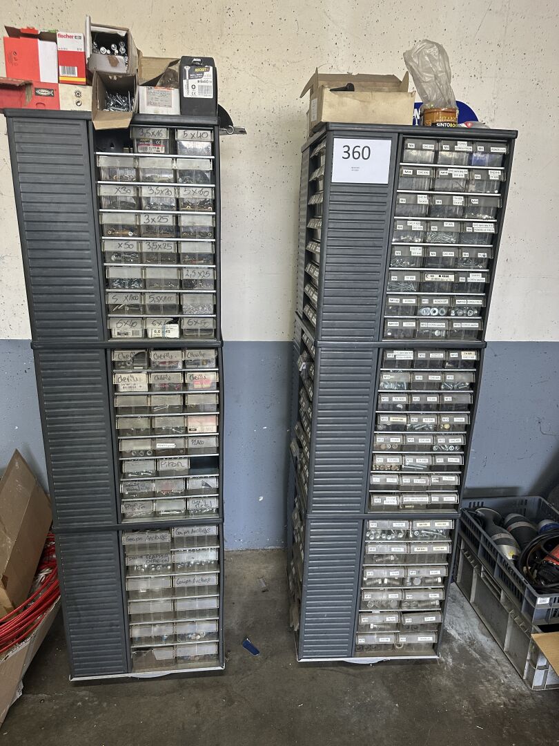 2 étagères à pièces colonnes tournantes plastique gris avec contenu de petite quincaillerie...