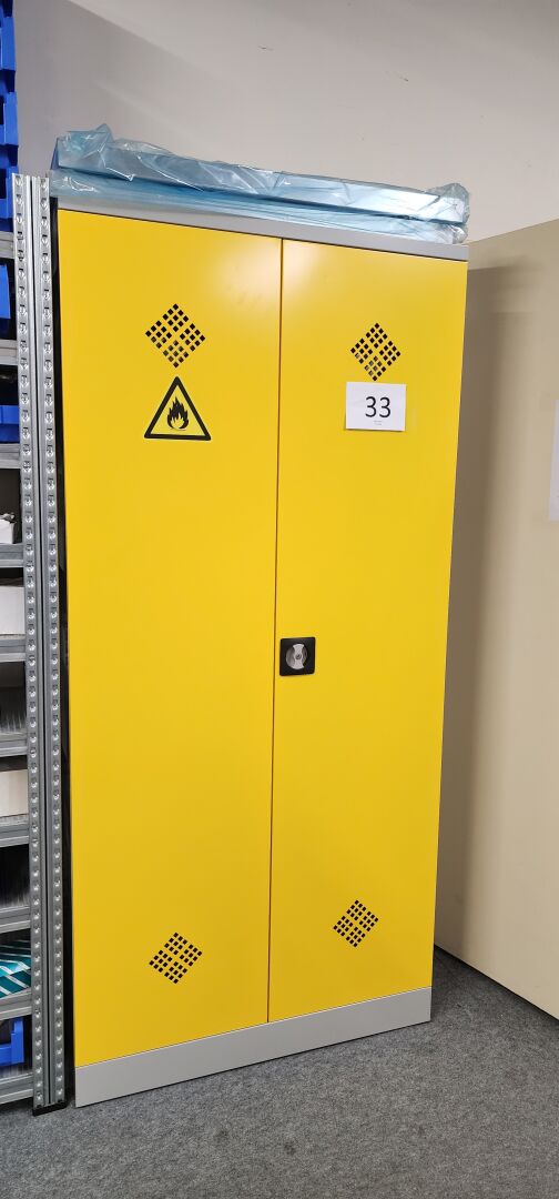 1 armoire anti-feu métal gris et jaune, 2 portes avec contenant produits chimiques 92 x 42 x 195...