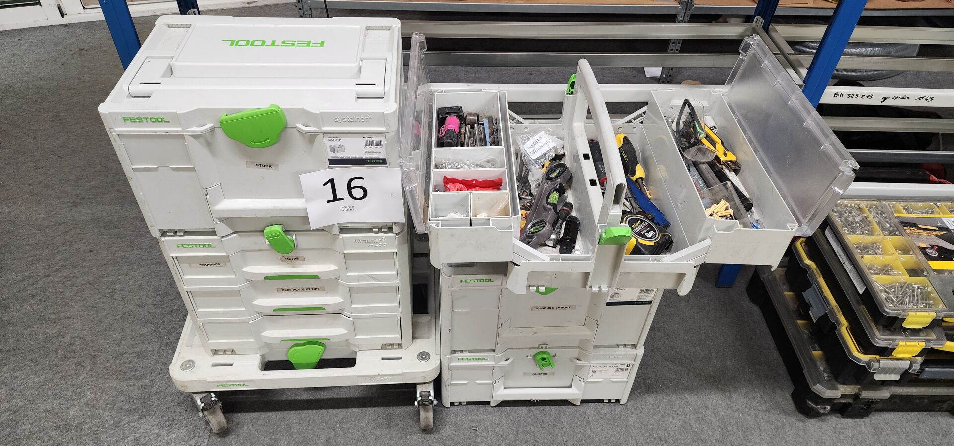3 coffrets empilables FESTOOL Systainer 3 et Sortainer T-Loc, sur planche mobile FESTOOL,...
