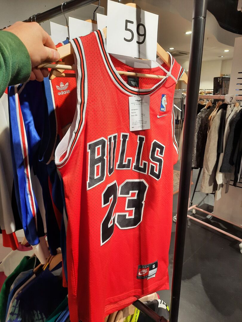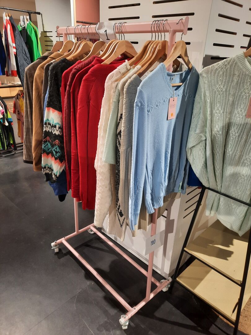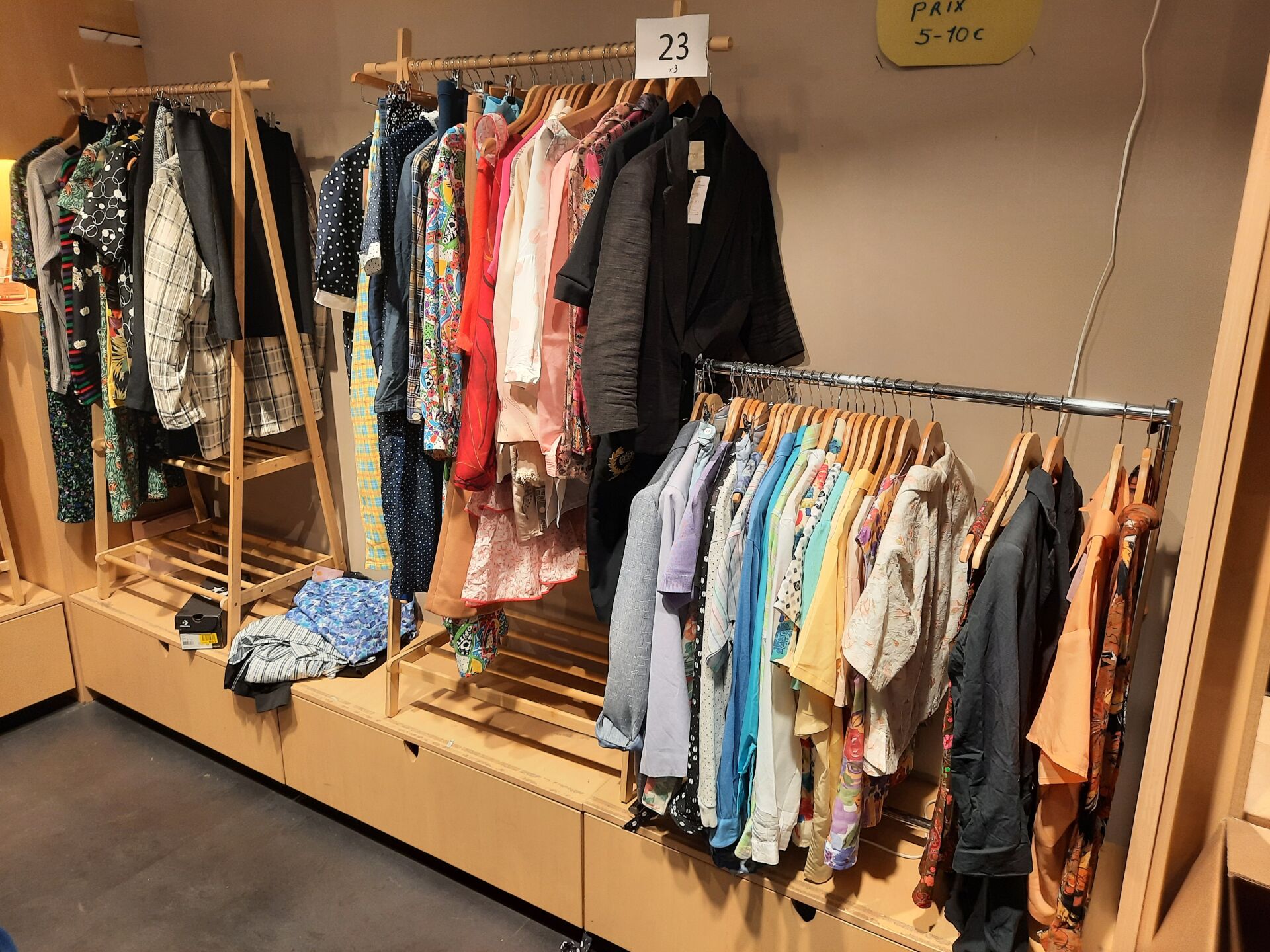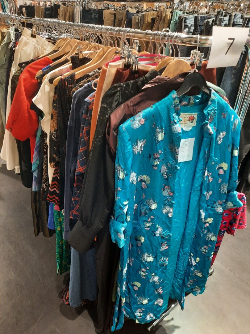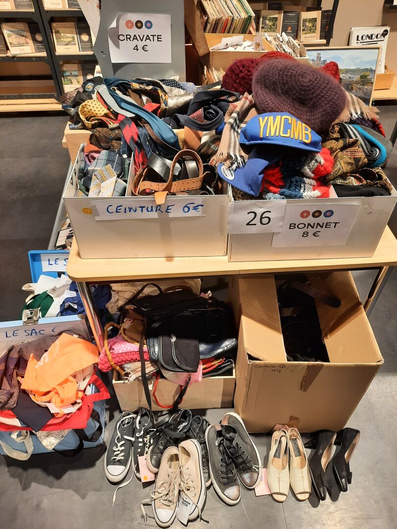 Dans la réserve, ensemble d’articles de prêt à porter de seconde main dans des sacs et...