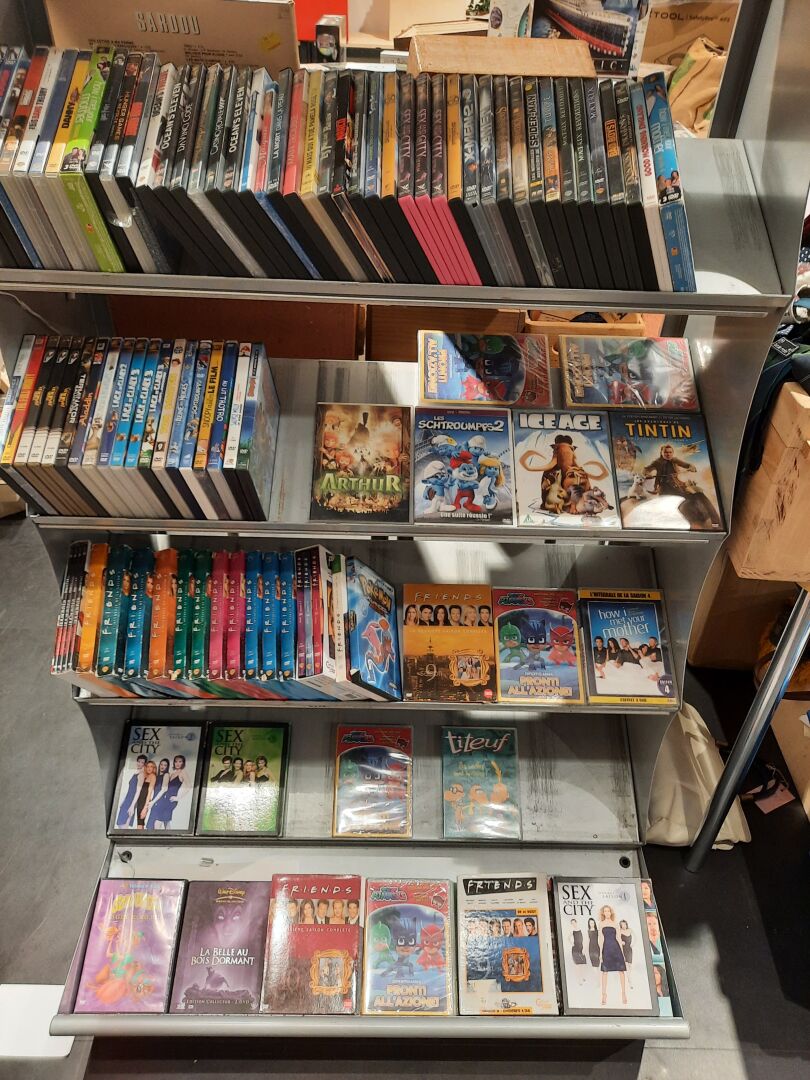 Ensemble de DVD, VHS, Vinyles, autocollant Panini, anciens numéros 11 Mondial, pin’s...