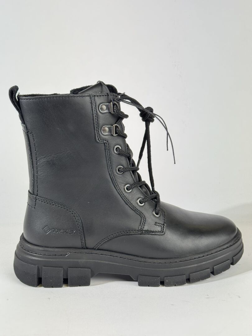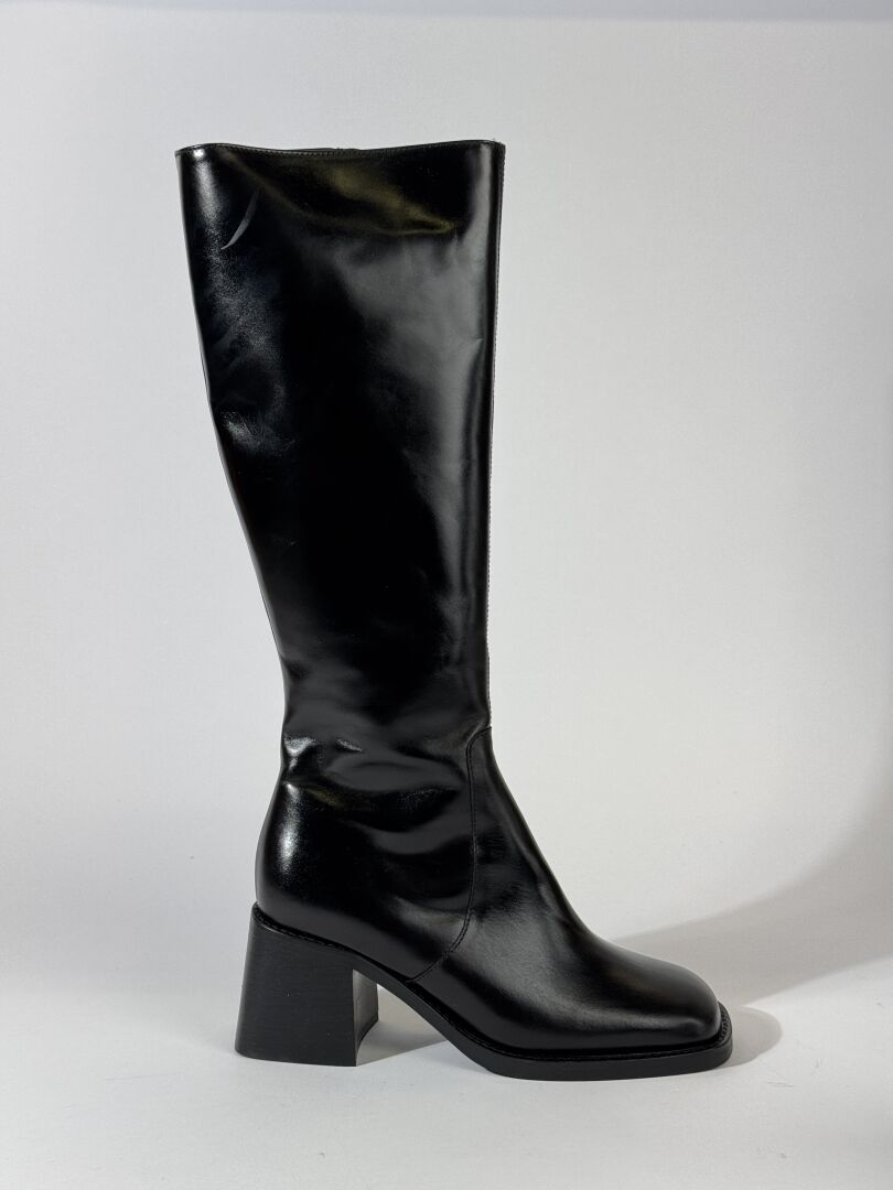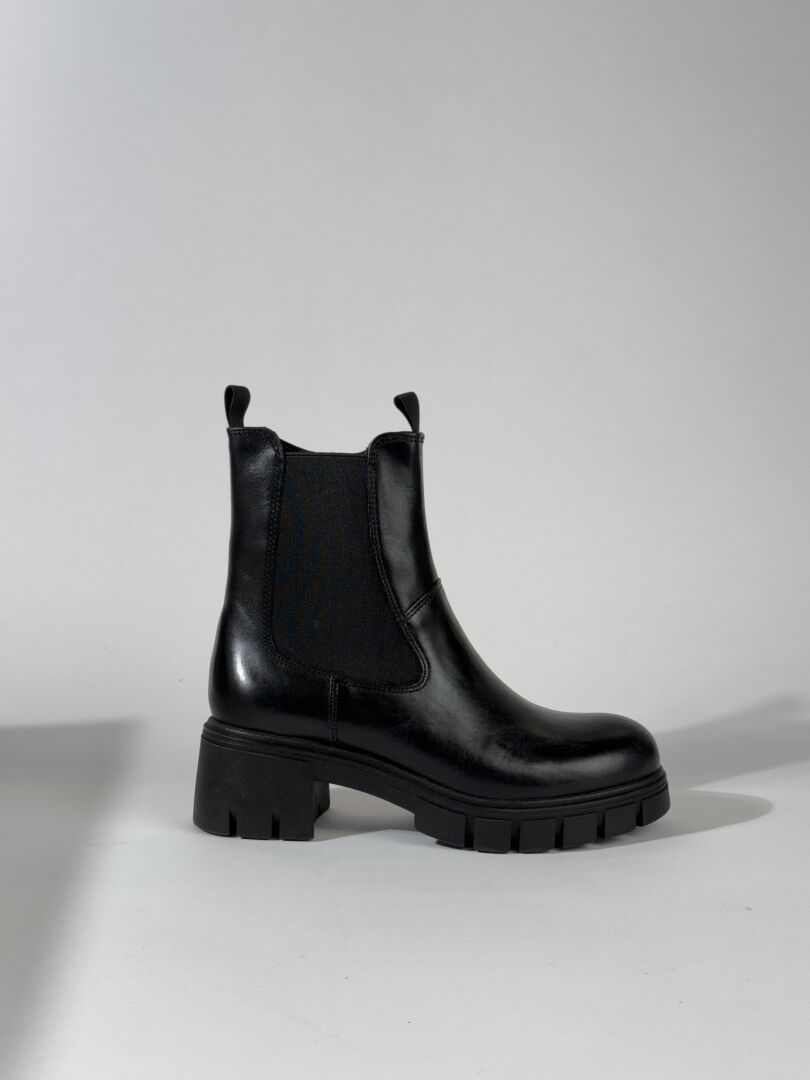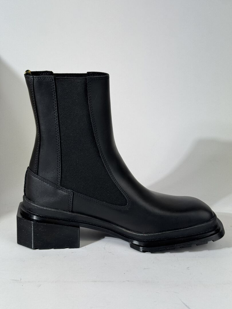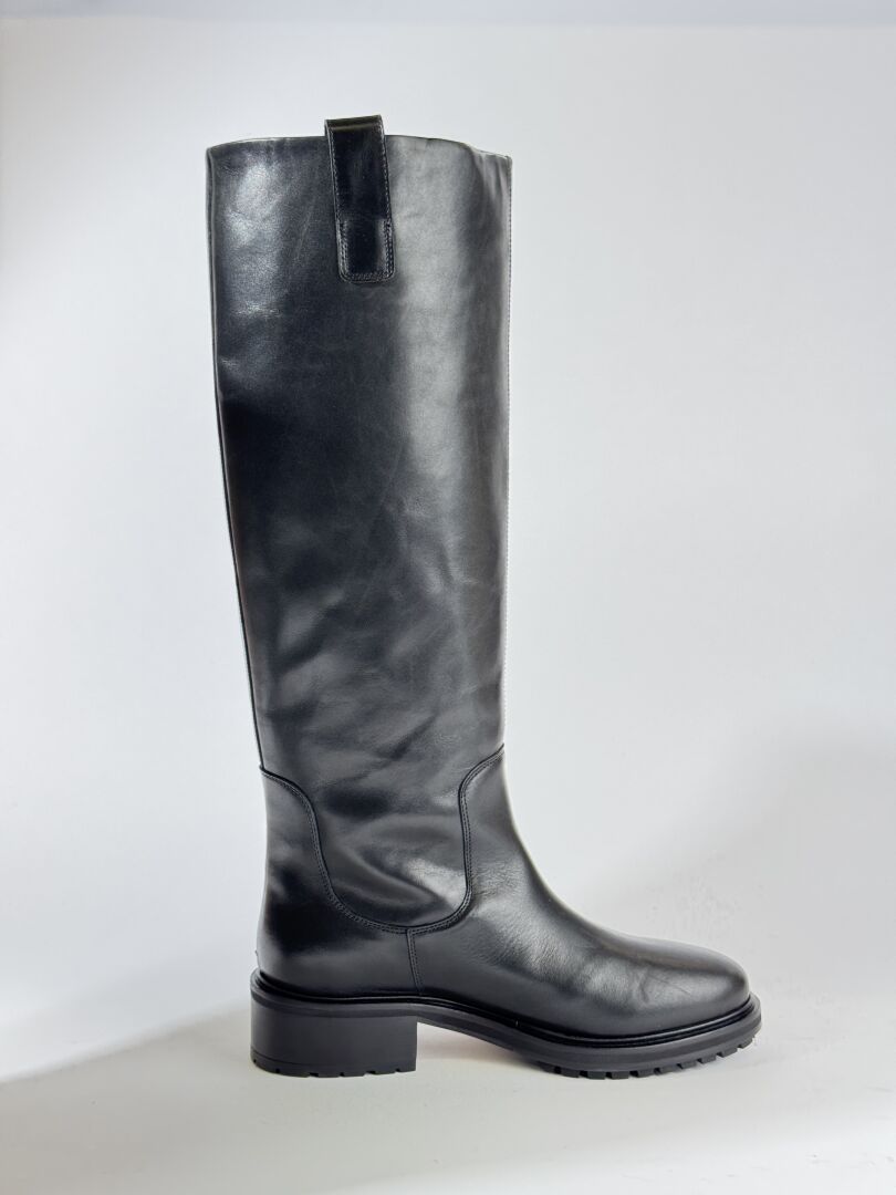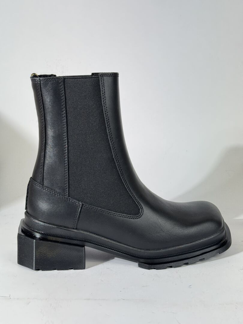AEYDE – Paire de bottes en cuir noir, semelles crantées, petit talon.