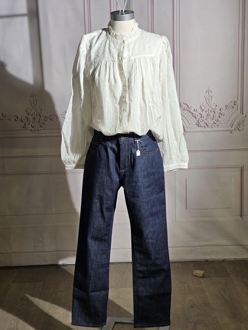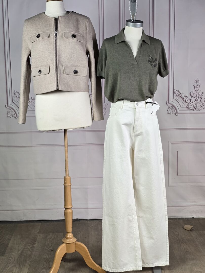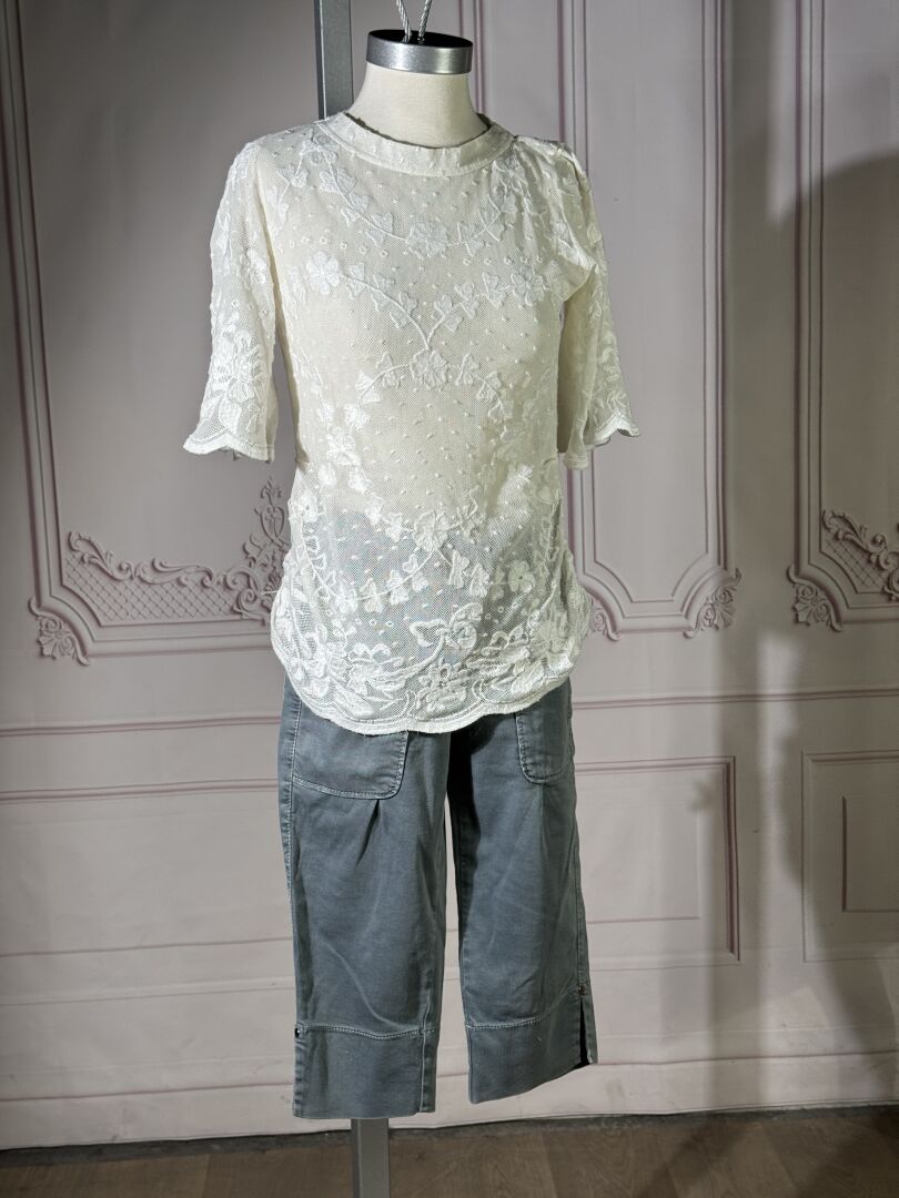 IKKS – Lot comprenant un jean denim blanc (taille 34), un top mailles fantaisie kaki, petit...