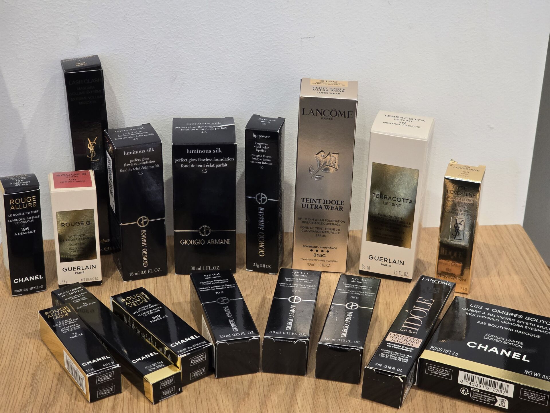 Fort ensemble d’environ 25 produits de maquillage dont rouges à lèvres, fond de teint,...
