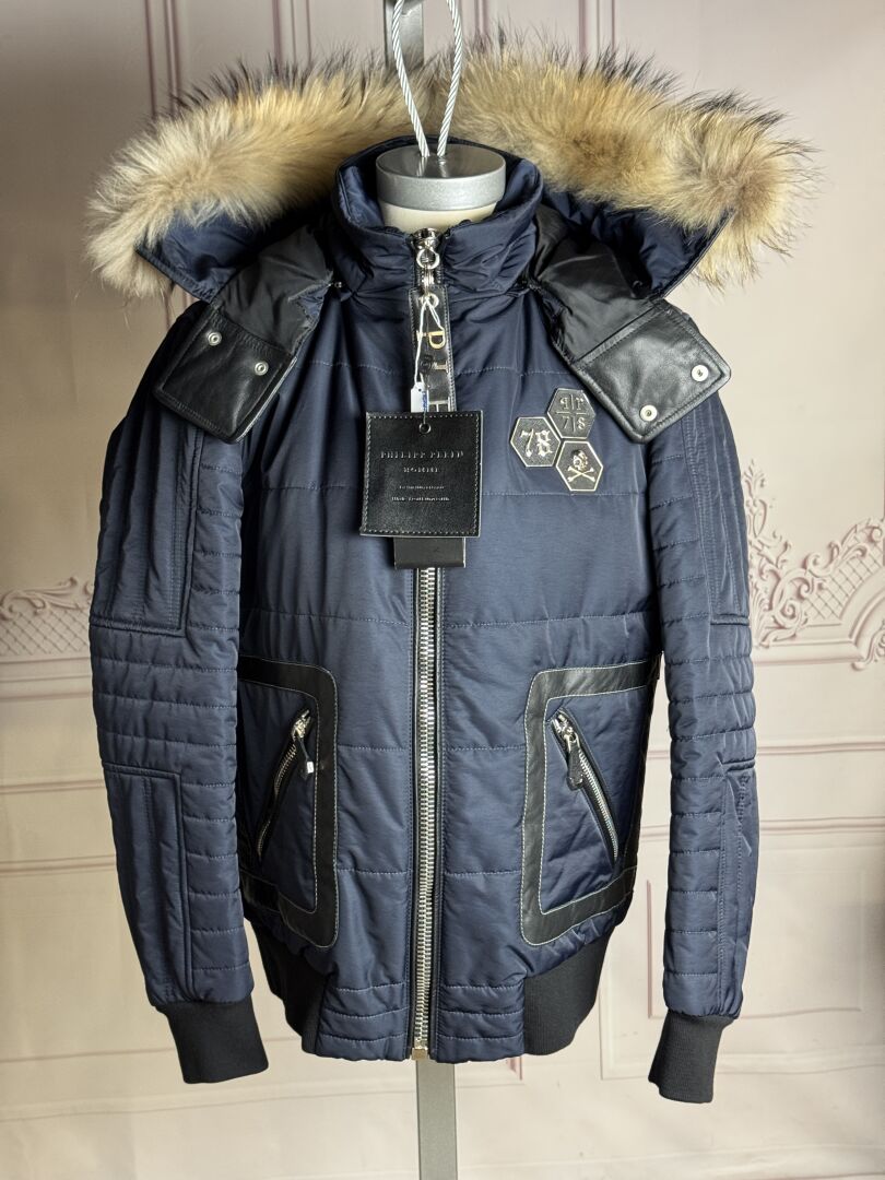 PHILIPP PLEIN – Manteau nylon marine effet matelassé et simili cuir noir, fermeture à...