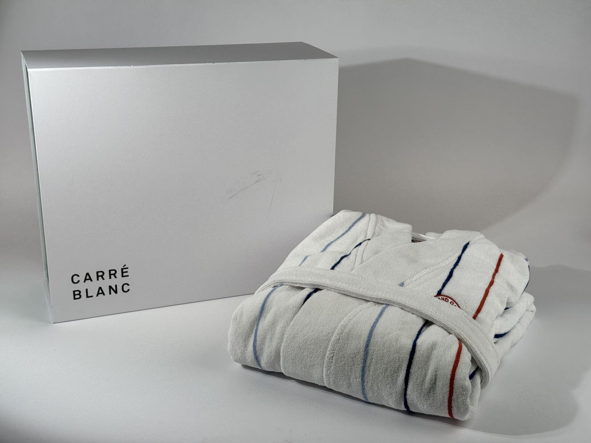 CARRE BLANC – Peignoir modèle « Roland Garros », éponge blanche, rayures bleues et...