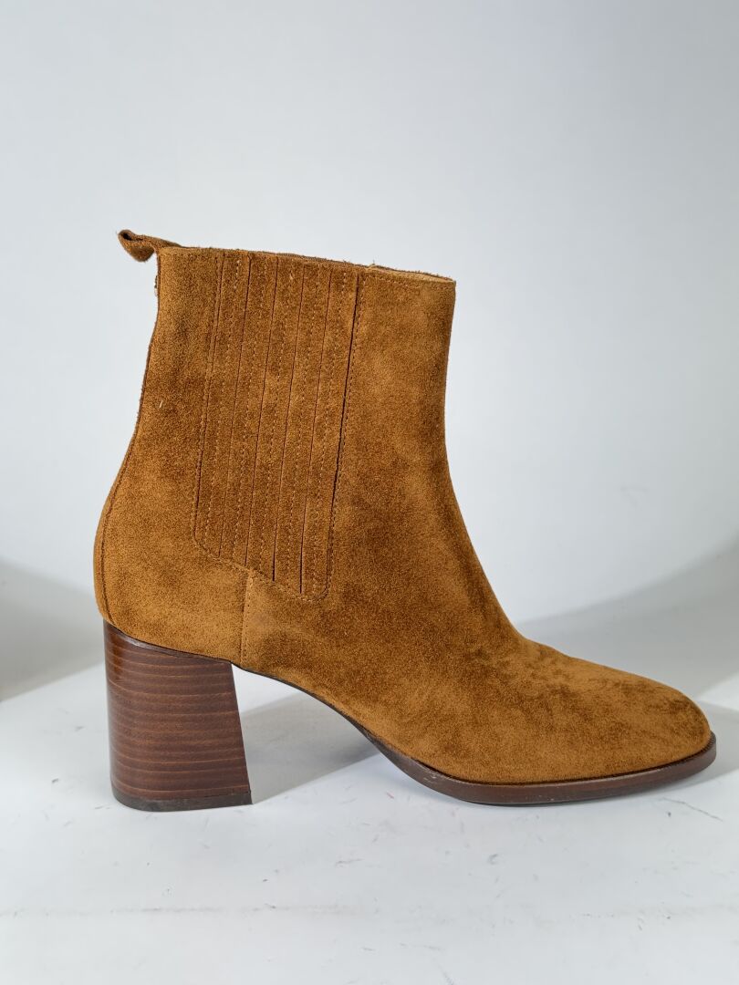 BOCAGE – Paire de bottines à talon, daim caramel. Boite.