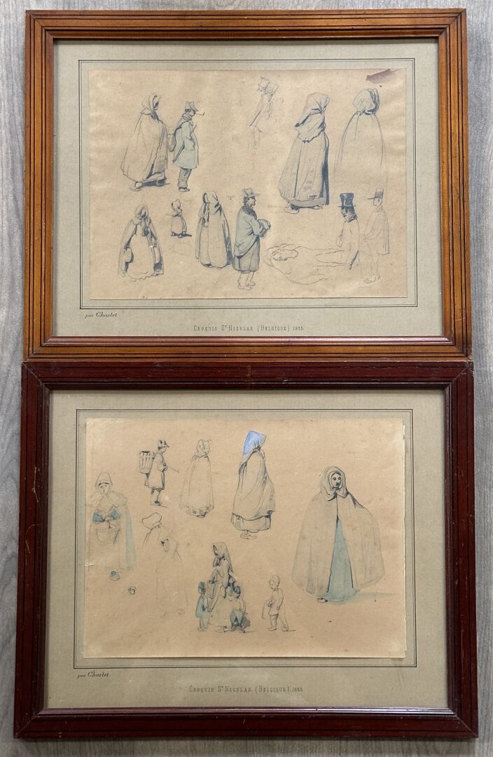 Suite de deux feuilles de croquis de personnages, l’une avec annotation de couleurs (petits...