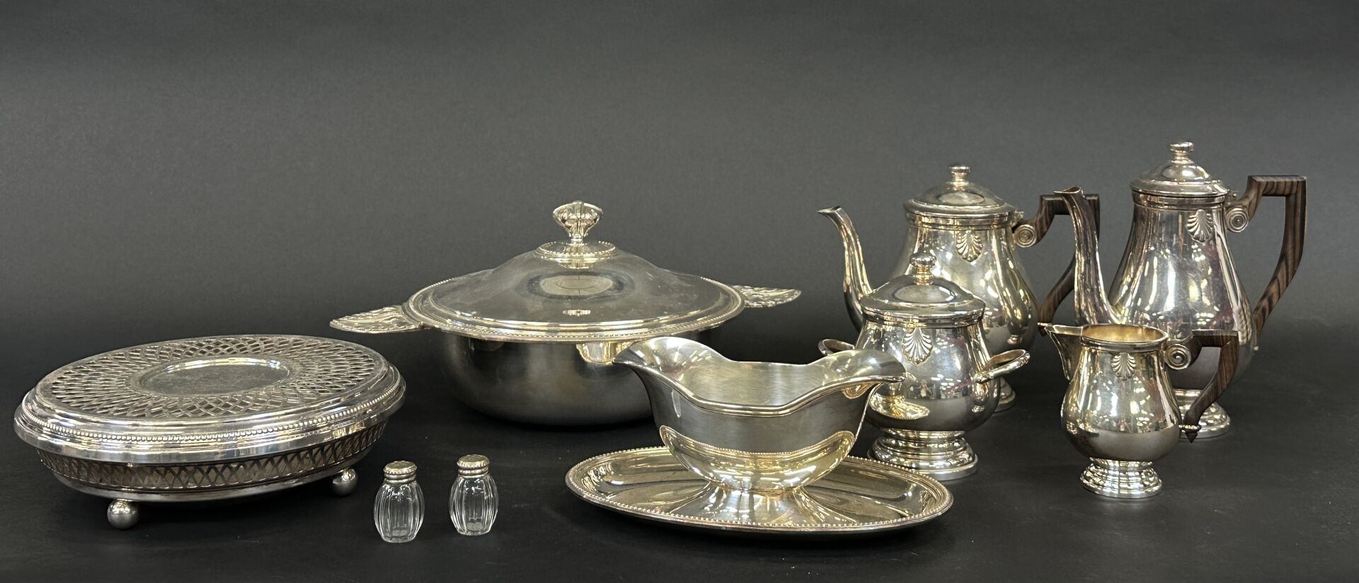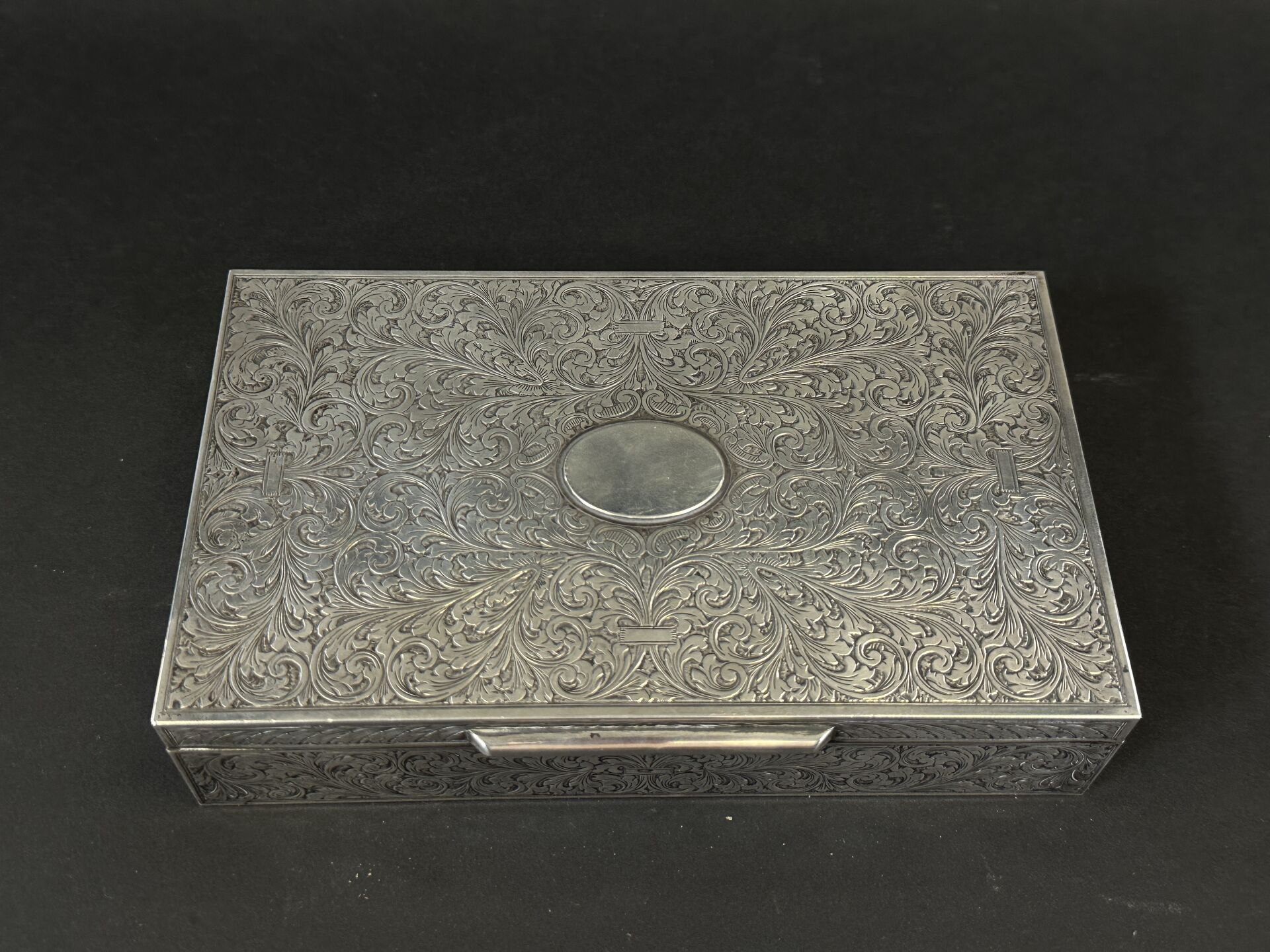 Boîte à cigarettes rectangulaire, l’âme en bois, parée d’argent 800 millièmes à...