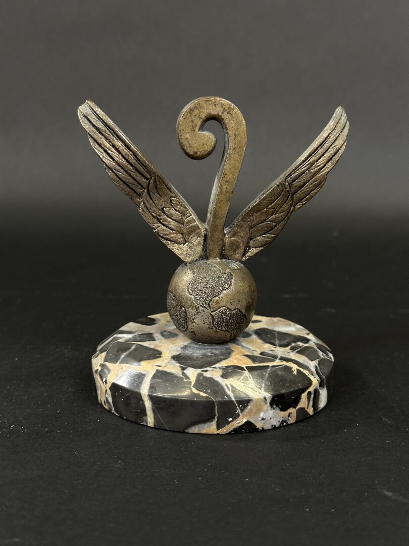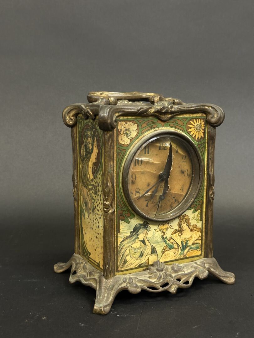 Pendulette de table en bronze à décor Art Nouveau et plaques en laiton lithographiées dans le...