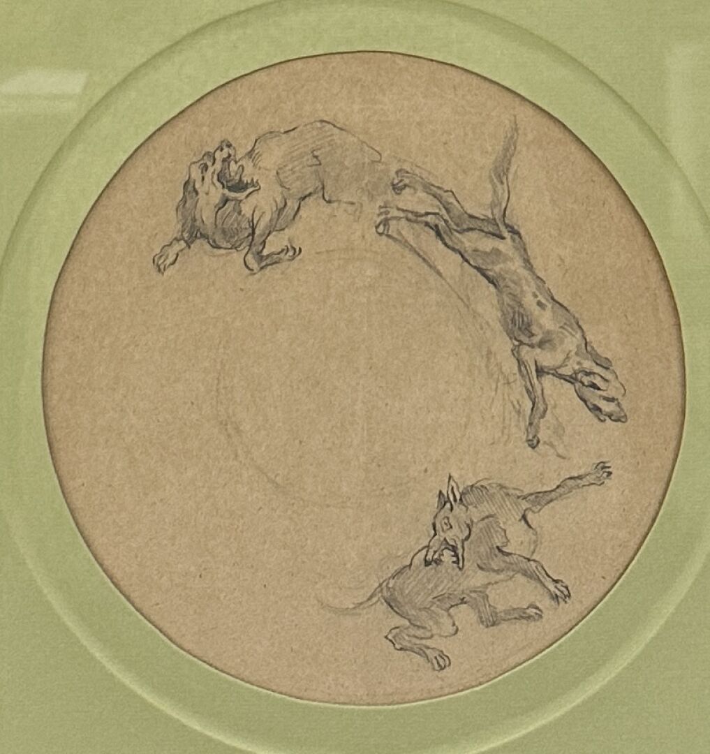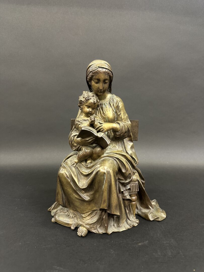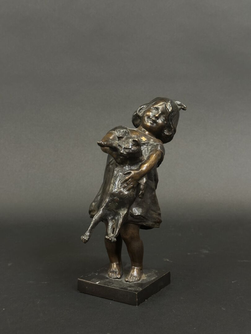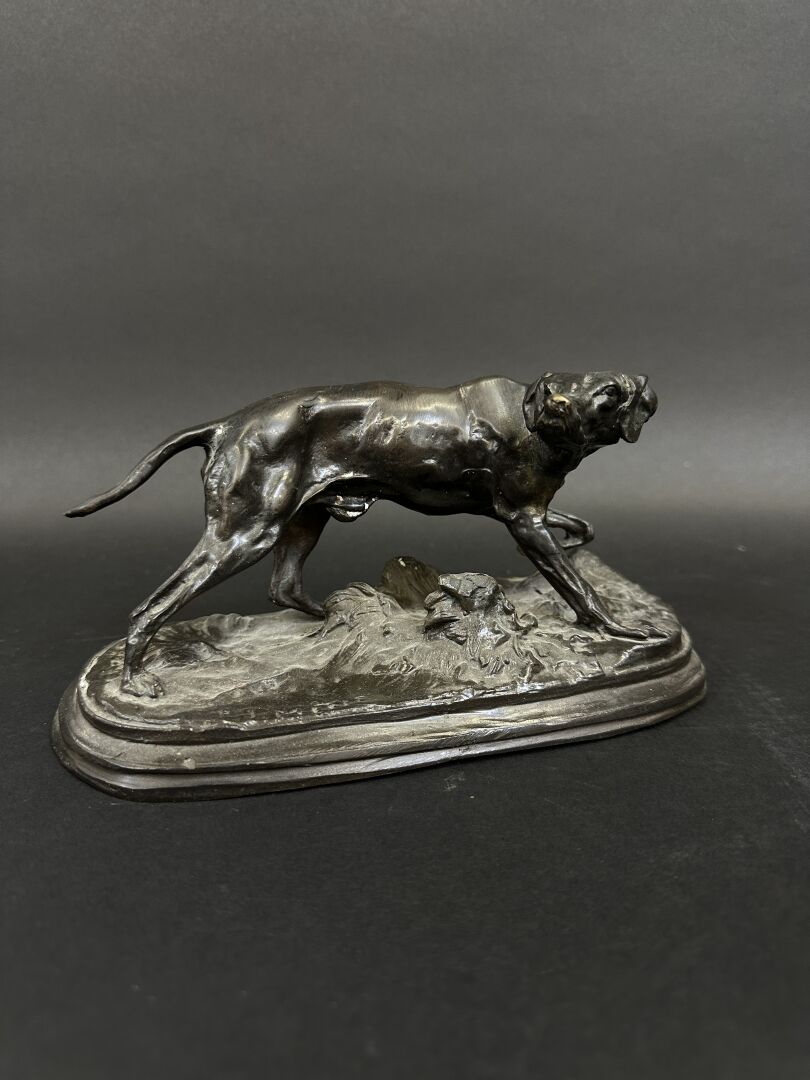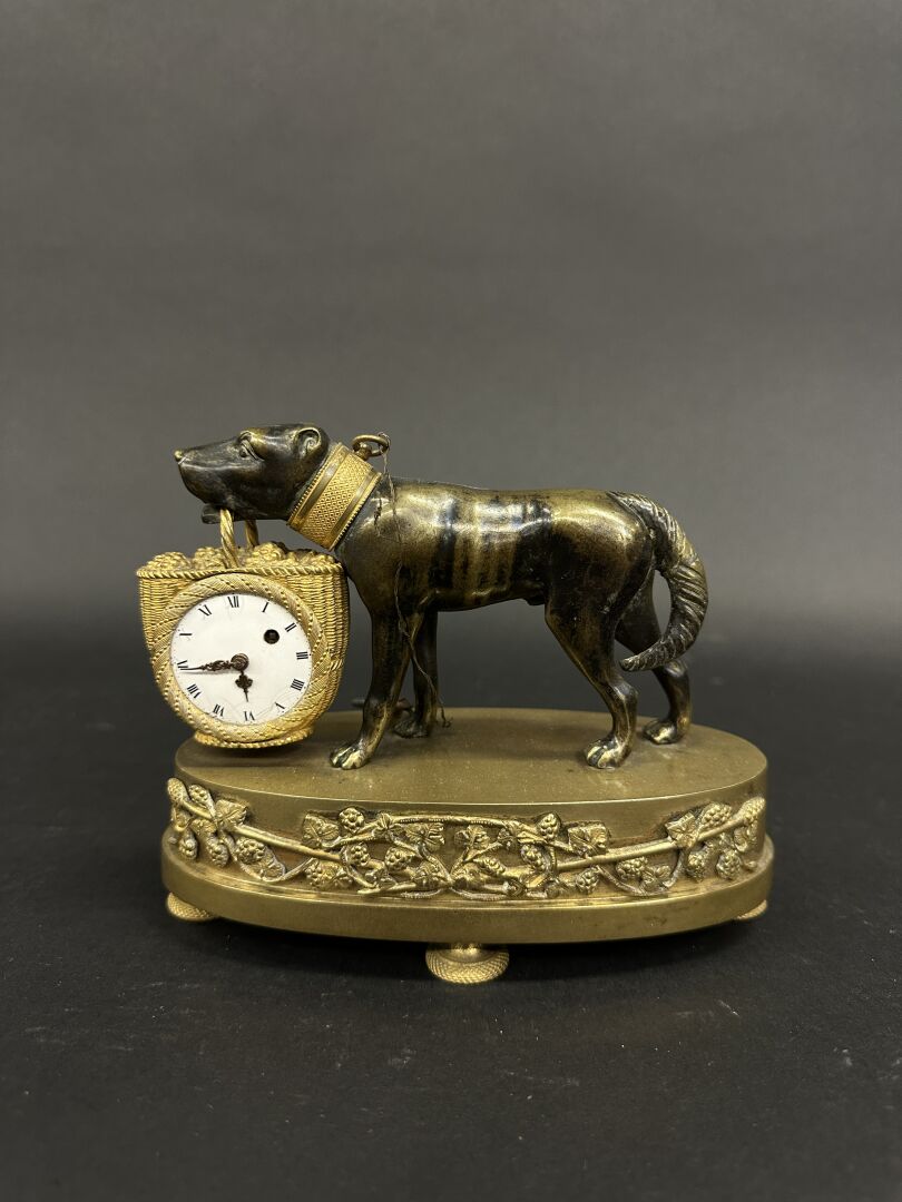 Pendulette en bronze à patine brune et dorée figurant un chien tenant dans sa gueule un panier...