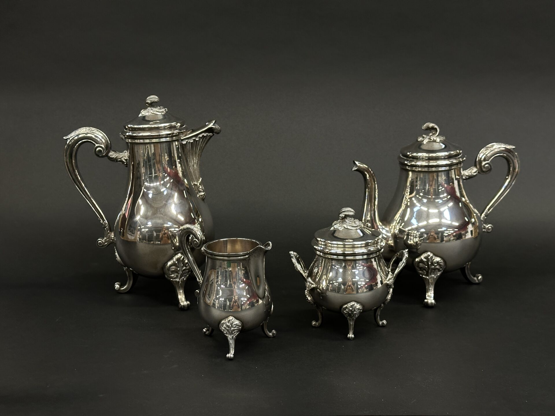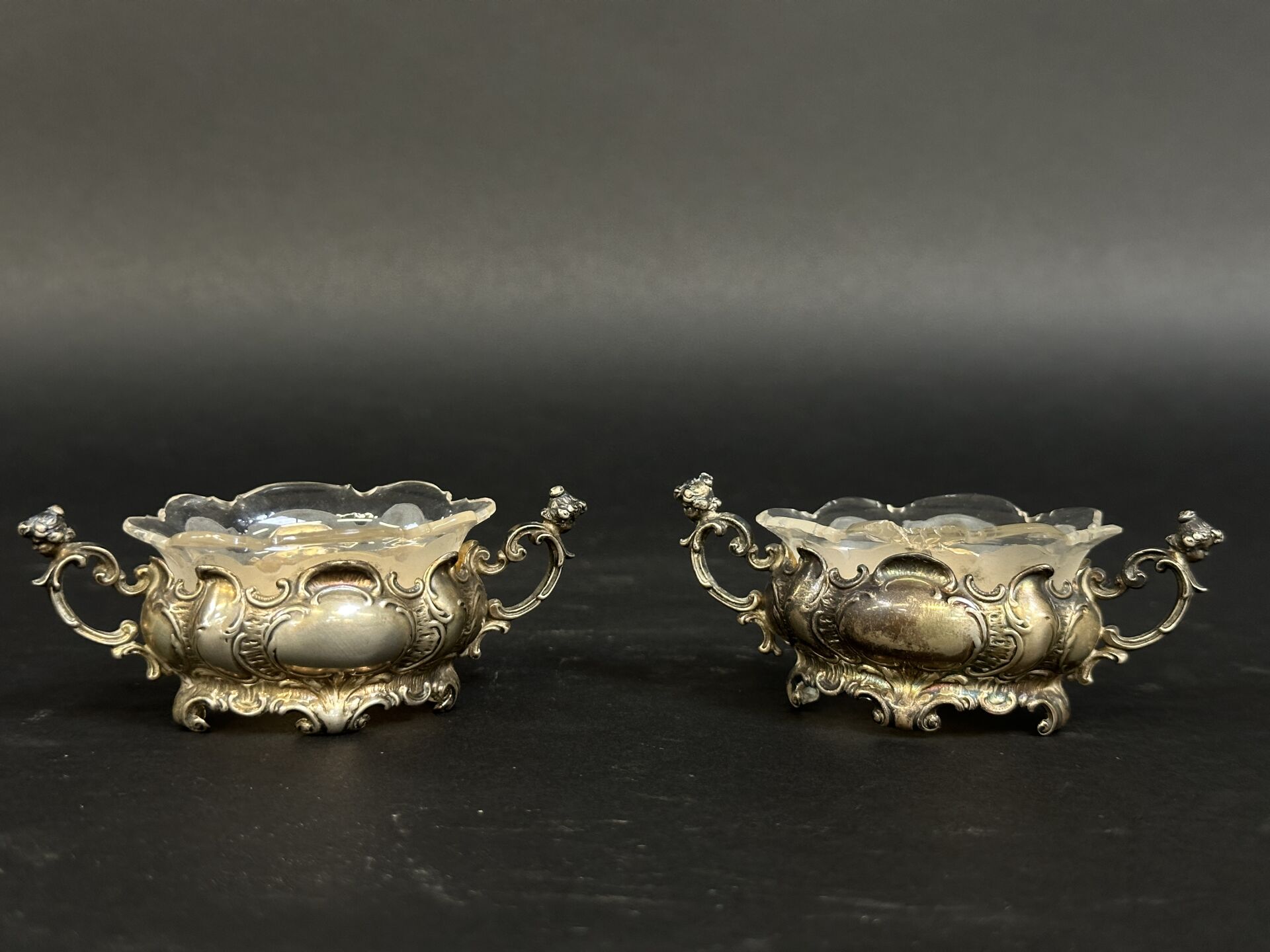 Paire de salerons en métal argenté à décor rocaille, les anses latérales surmontées...