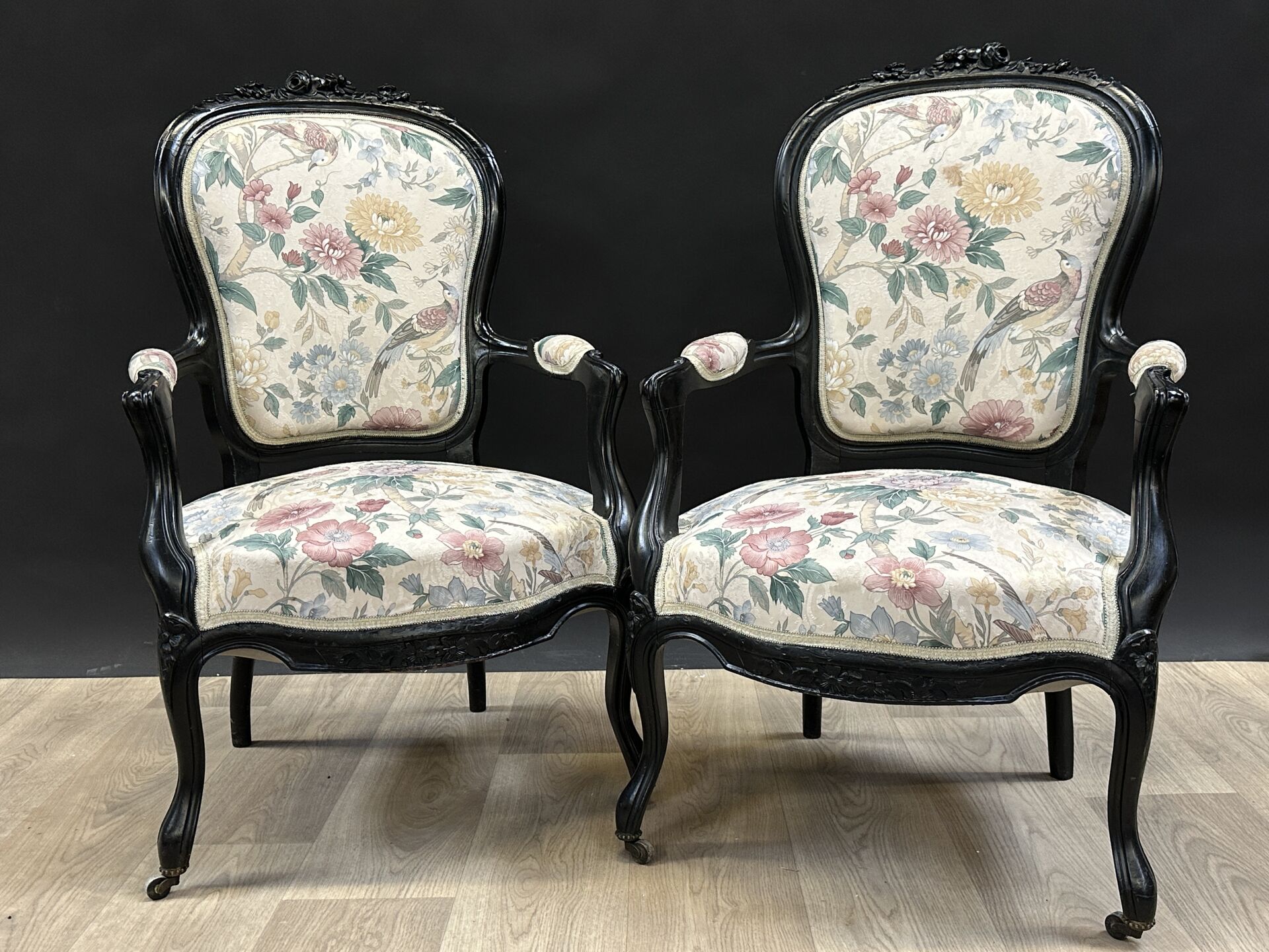 Paire de fauteuils en bois mouluré laqué noir à décor de fleurettes, dossier violoné, les...