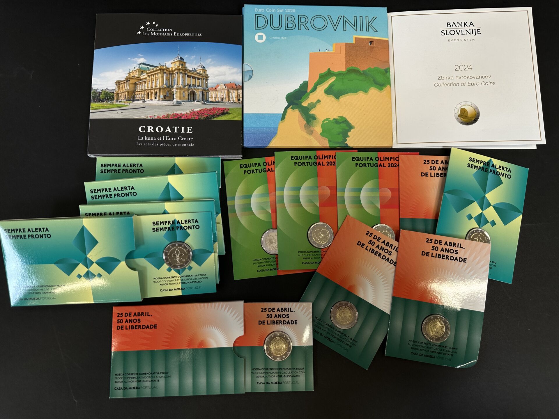 12 pièces de 2 euros sous coincard (Portugal), 1 coffret BU série d’euro 2024 Slovénie,...
