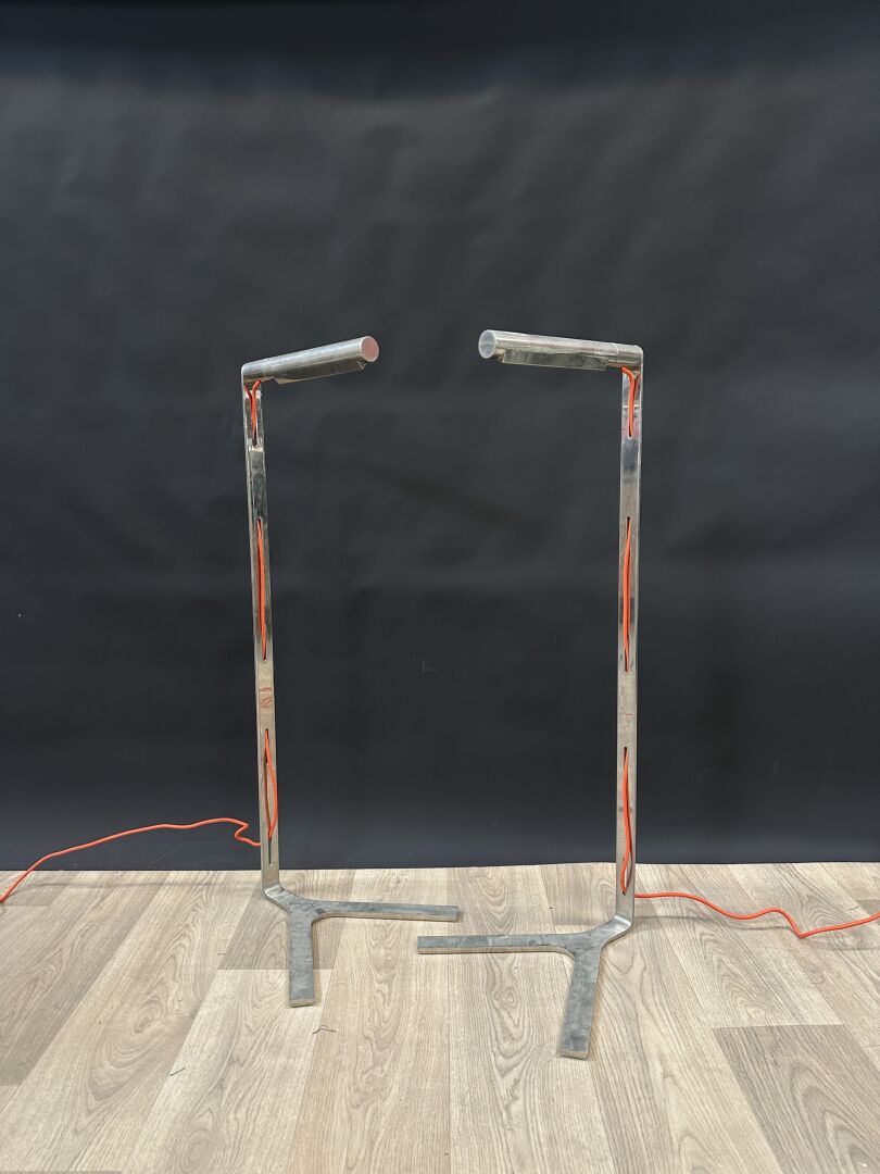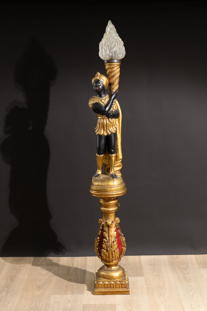 Lampadaire à trois bras de lumières et lustre à six bras de lumières en métal doré à...
