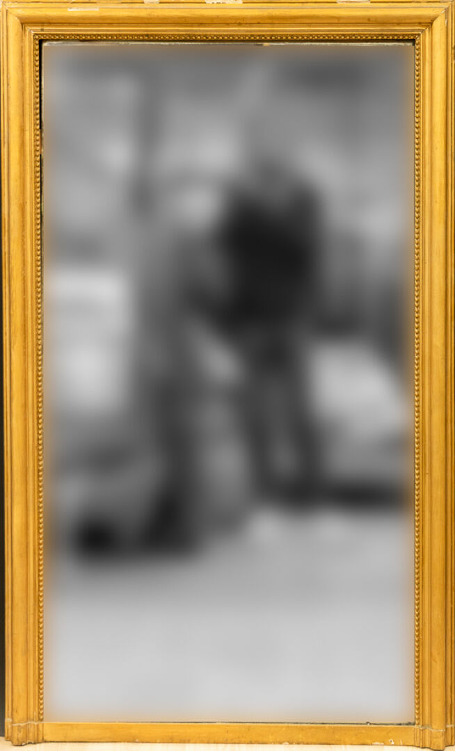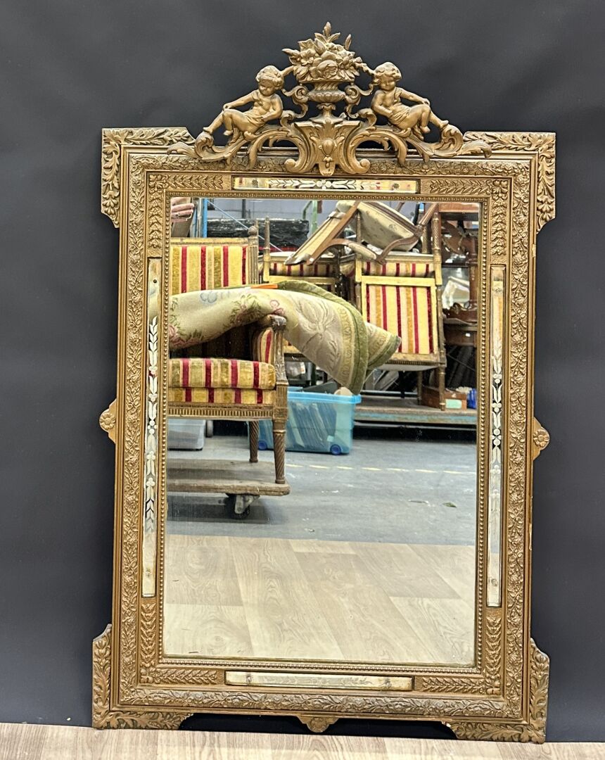 Miroir de cheminée en bois stuqué doré, mouluré d’une frise de perles (manques, miroir...