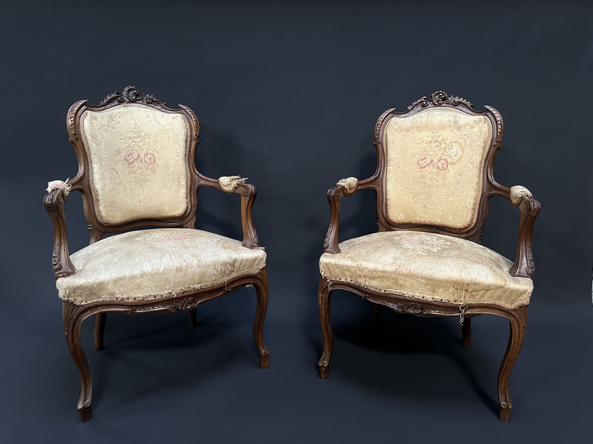 Paire de fauteuils cabriolets en bois naturel mouluré et sculpté de motifs rocaille. Les bras...