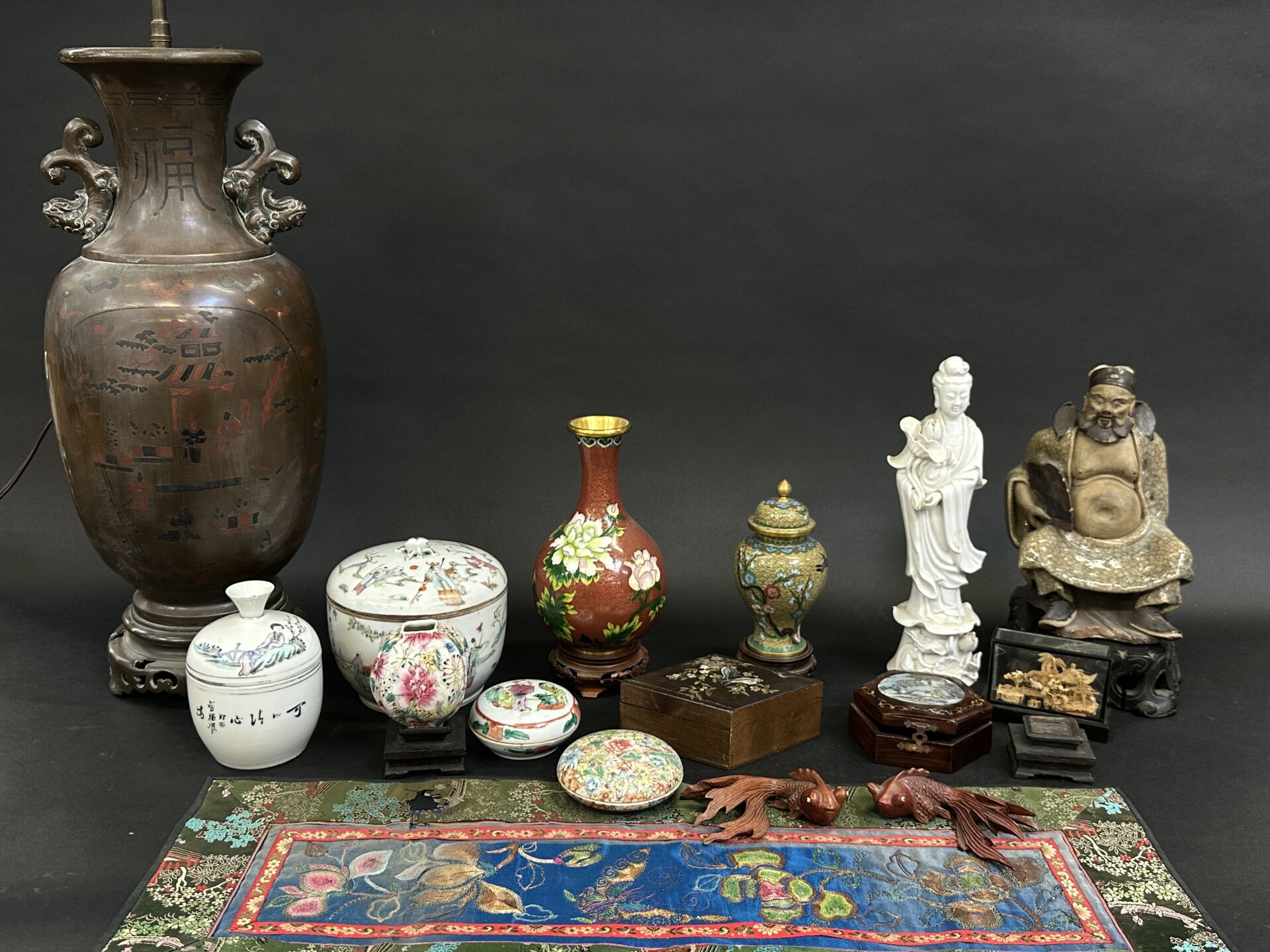 Réunion d’objets décoratifs asiatiques dont vases en émaux cloisonnés, boîtes en...