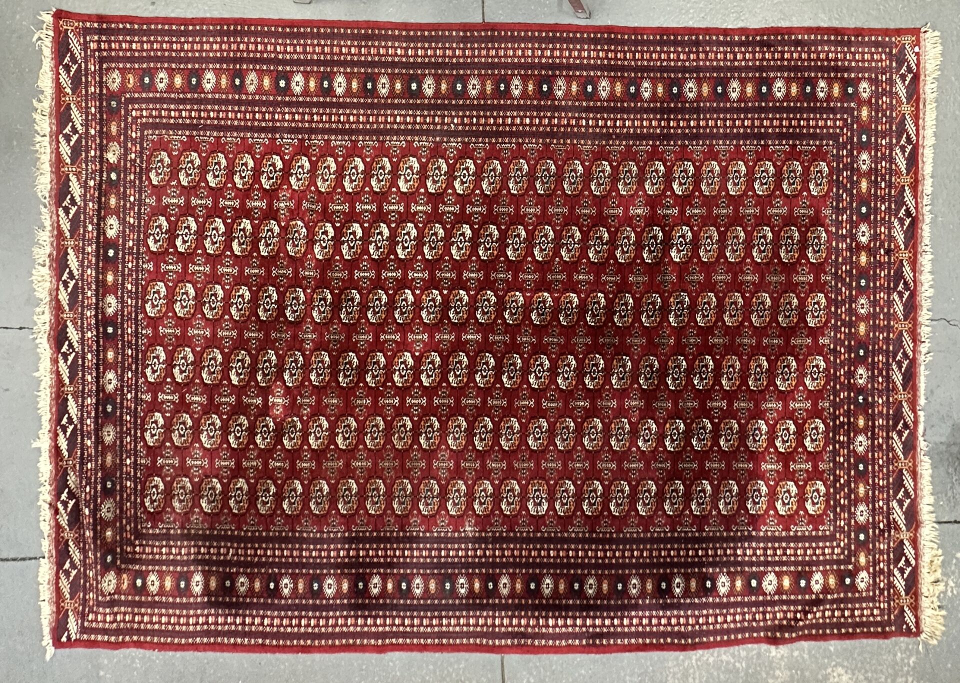 Tapis à décor polychrome d’une couronne fleurie centrale, fleurs et formes géométriques...