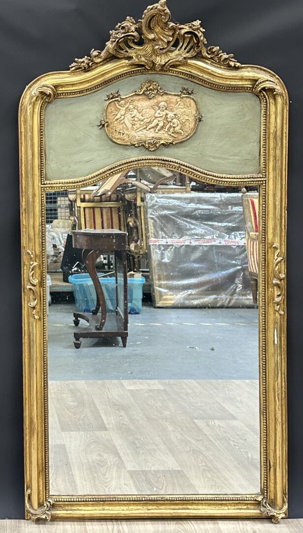 Trumeau en bois et stuc laqué vert et rechamopi or à décor en partie haute d’amours...