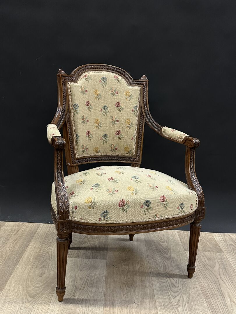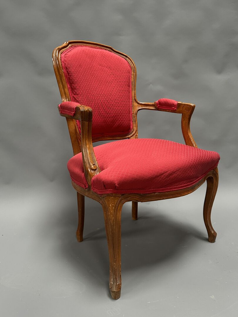 Fauteuil cabriolet en noyer mouluré, les accotoirs à manchettes, le dossier violoné, les pieds...