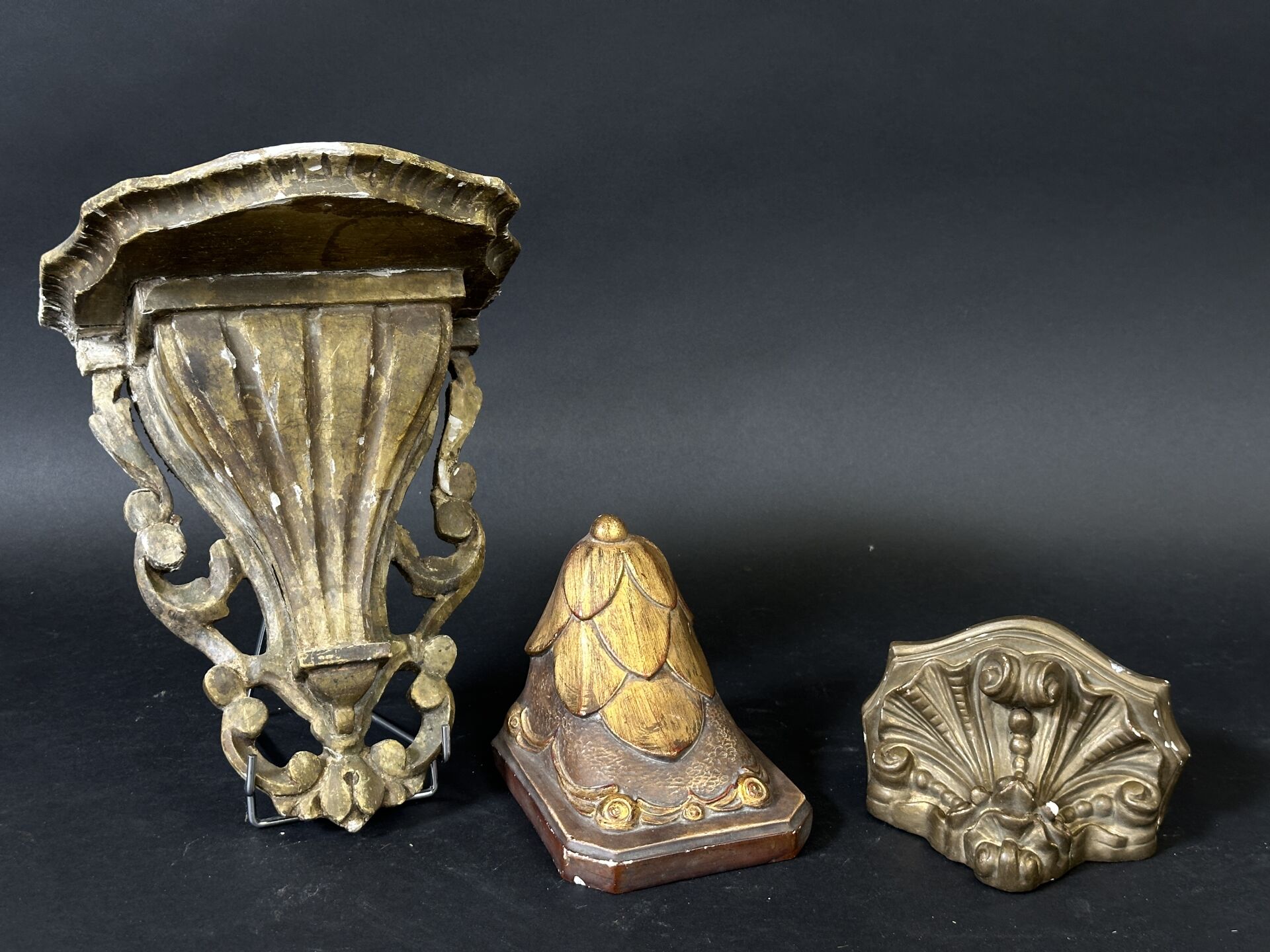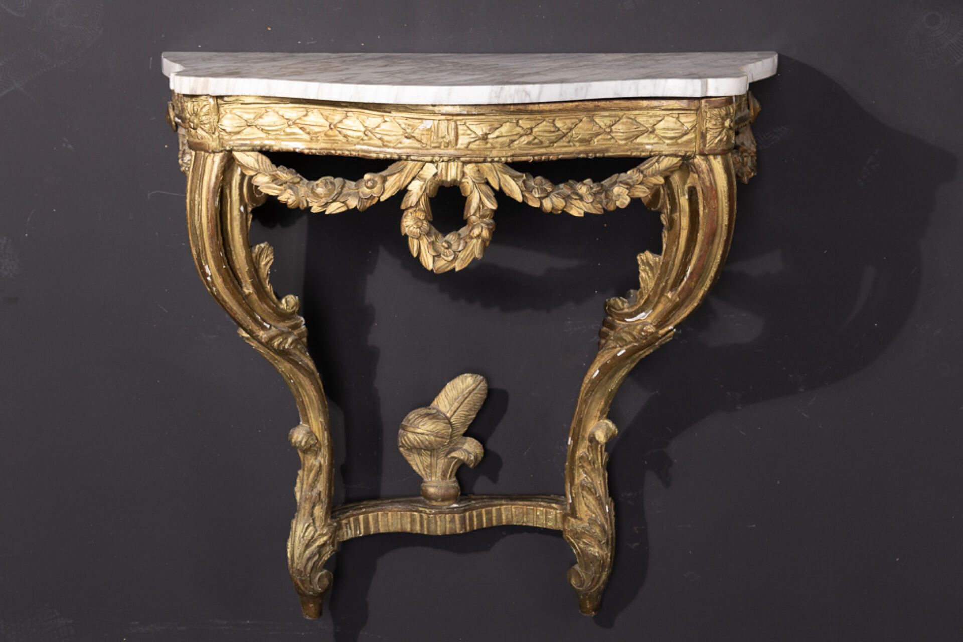 Console d’applique en bois sculpté, redoré, coiffée d’un marbre blanc veiné gris...