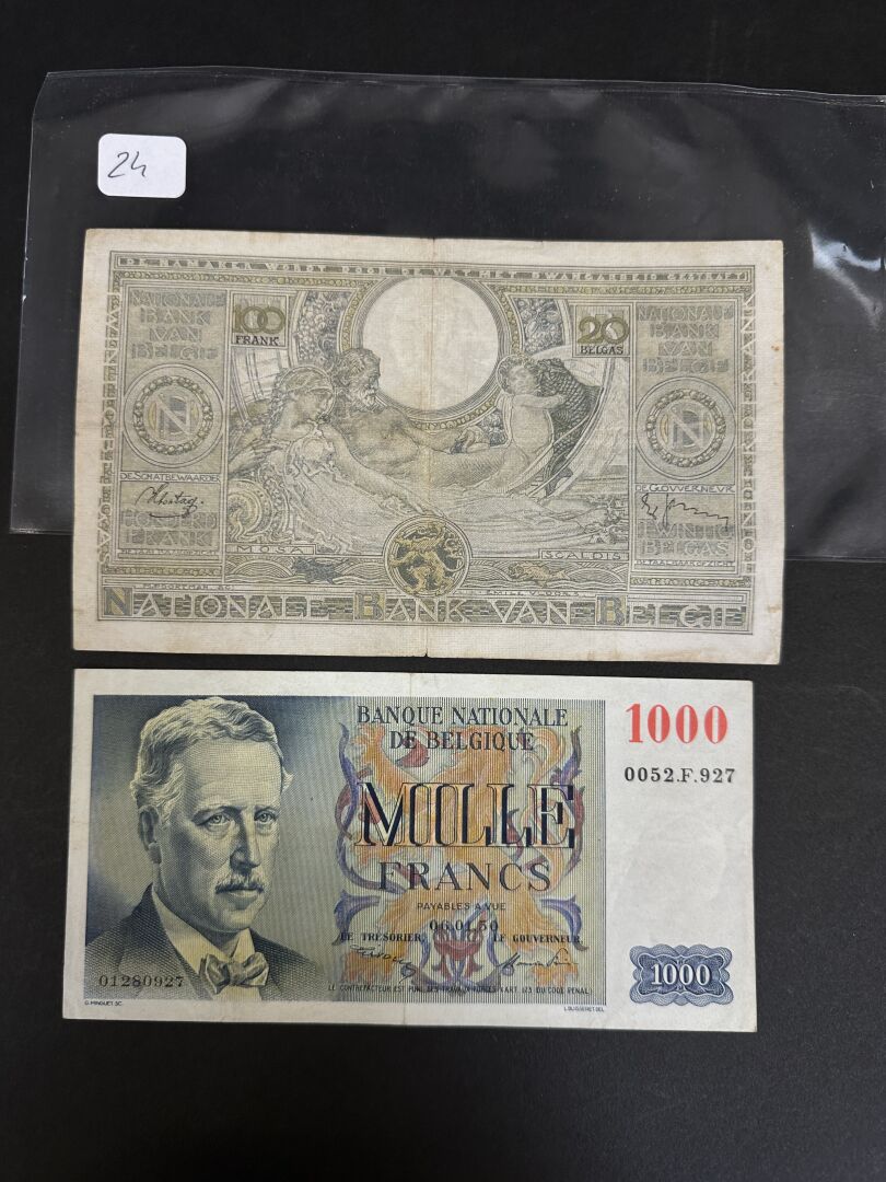 Deux billets de Belgique : 1000 Francs type Centenaire 06/01/1950 et 20 Belgas recto néerlandais...