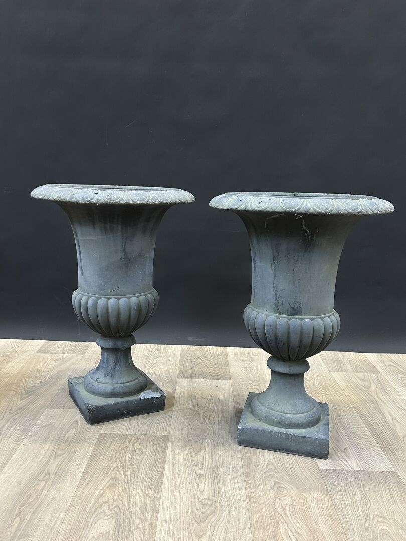 Paire de vases d’agréments de jardin en composition laquée grise de forme Médicis...