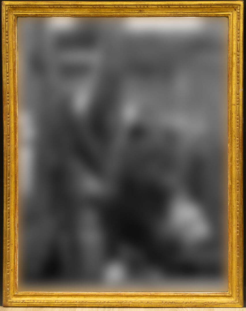 Miroir rectangulaire en bois stuqué doré à décor d’une frise ornementale.