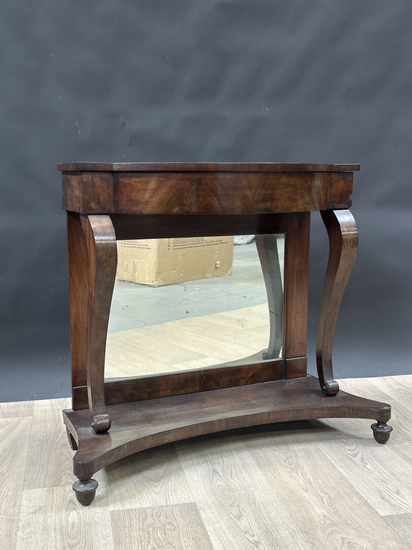 Console en placage d’acajou à fond de glace, les pieds avant violonés. L’ensemble...