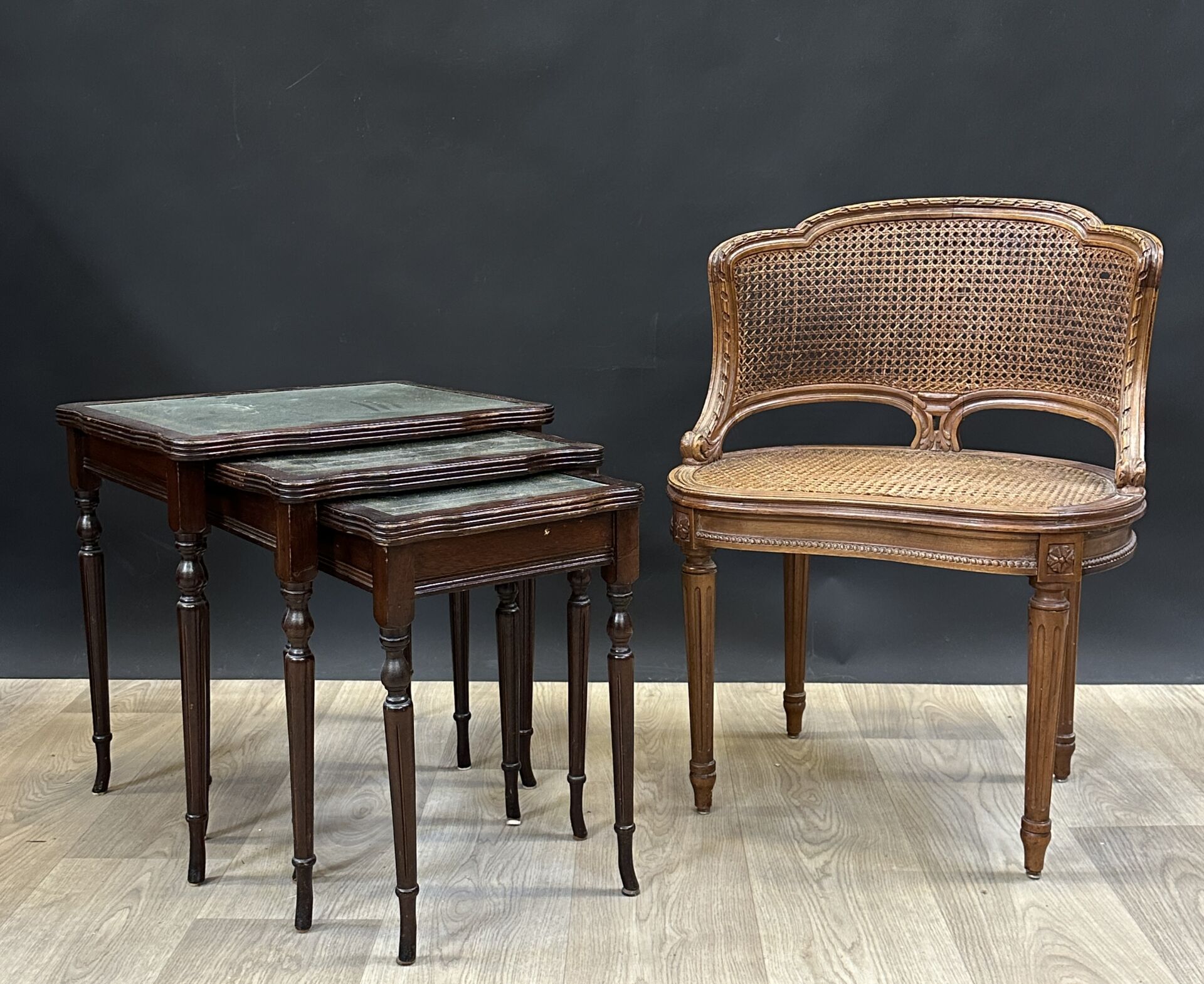 Salon comprenant une banquette et une paire de fauteuils en bois en partie cannés (accidents au...