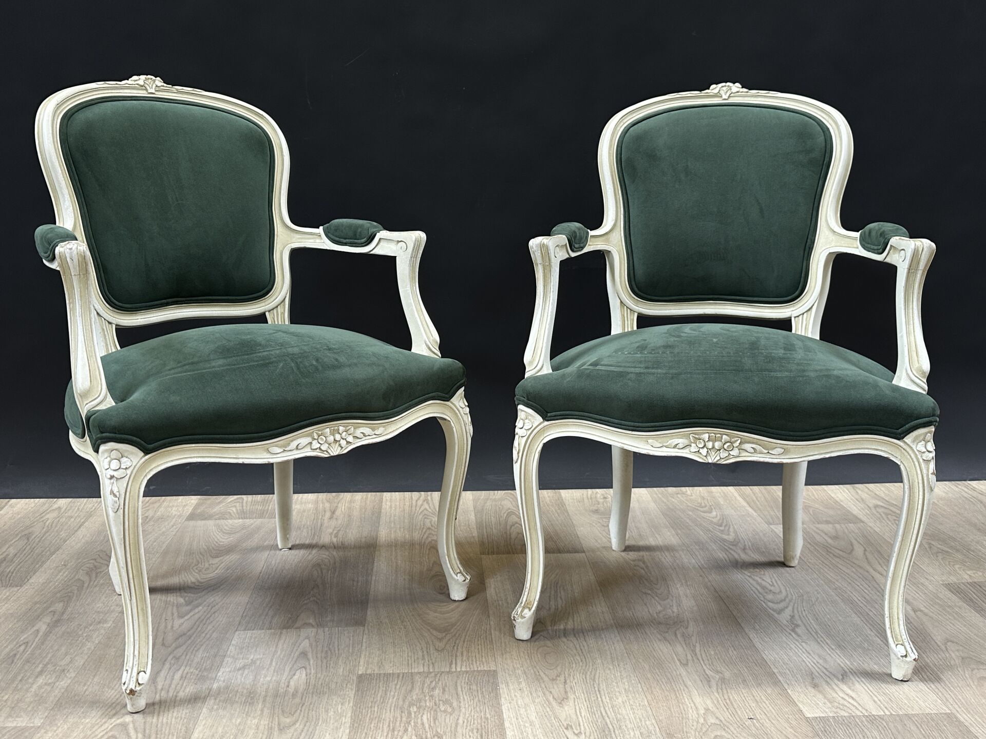 Paire de fauteuils cabriolets en bois mouluré relaqué blanc, orné de fleurettes, les pieds...