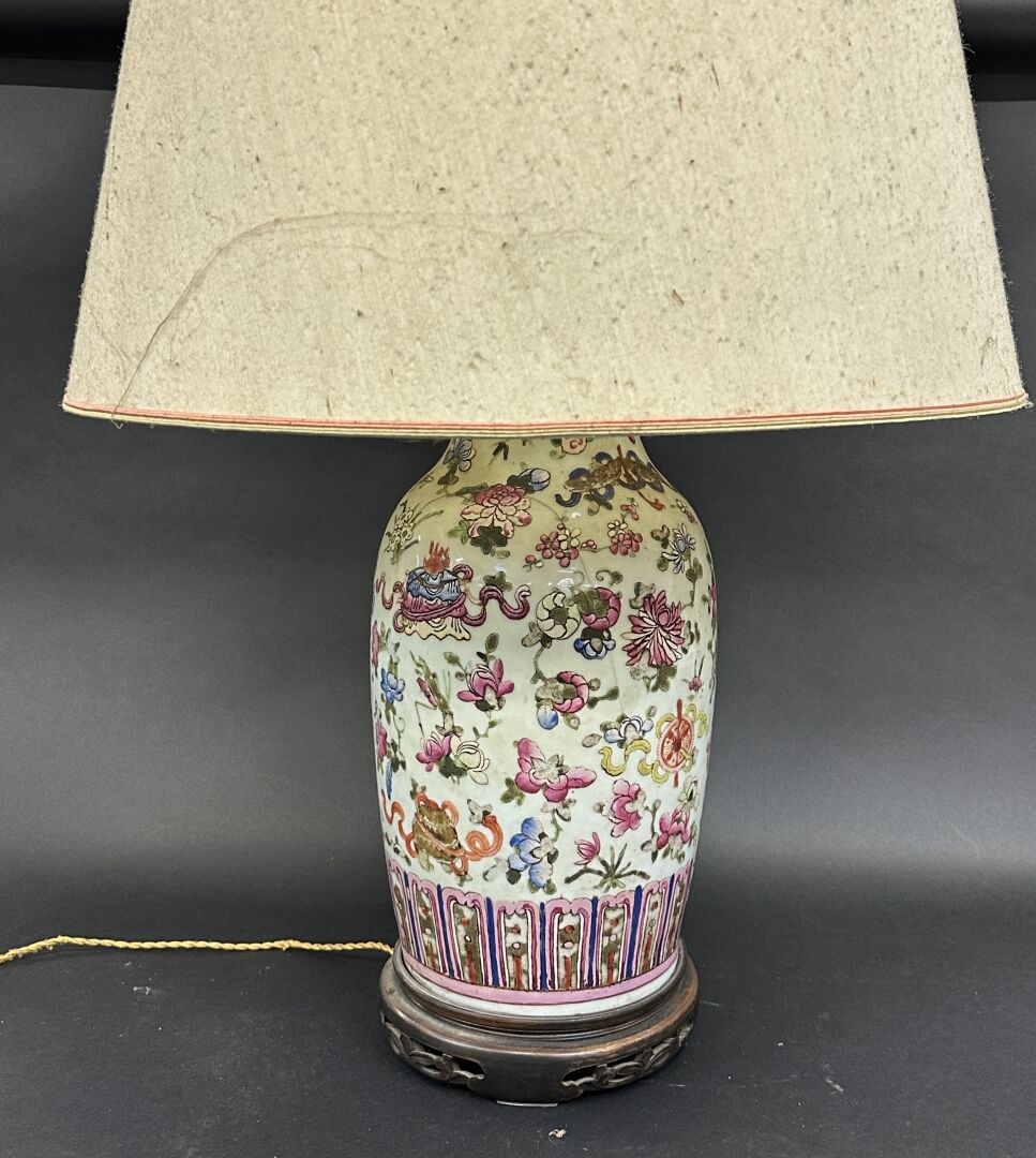 Vase en porcelaine à décor polychrome de fleurs, rubans et objets de lettre, monté en lampe...