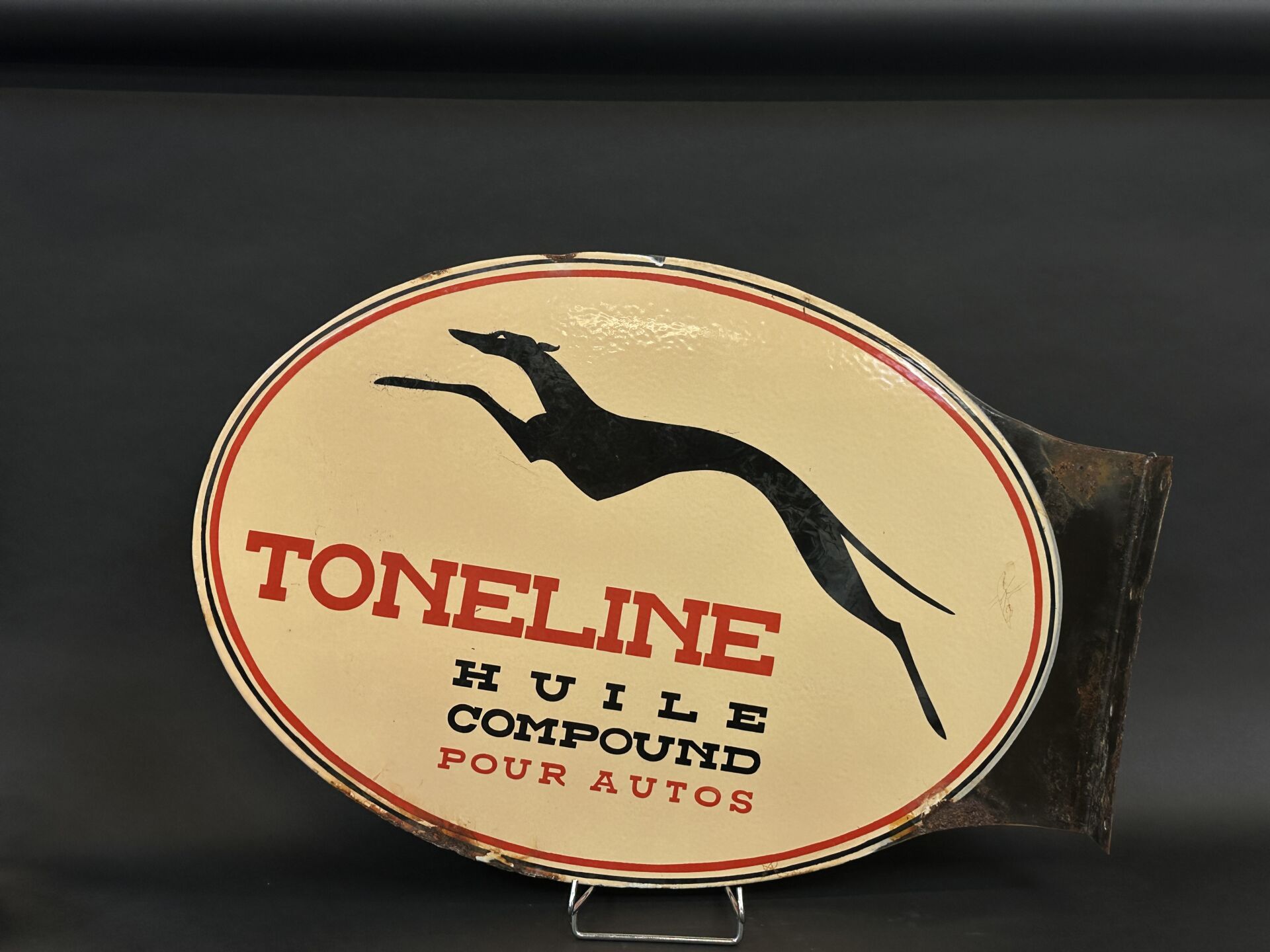Plaque publicitaire en tôle émaillée double face pour « TONELINE – Huile compound pour...
