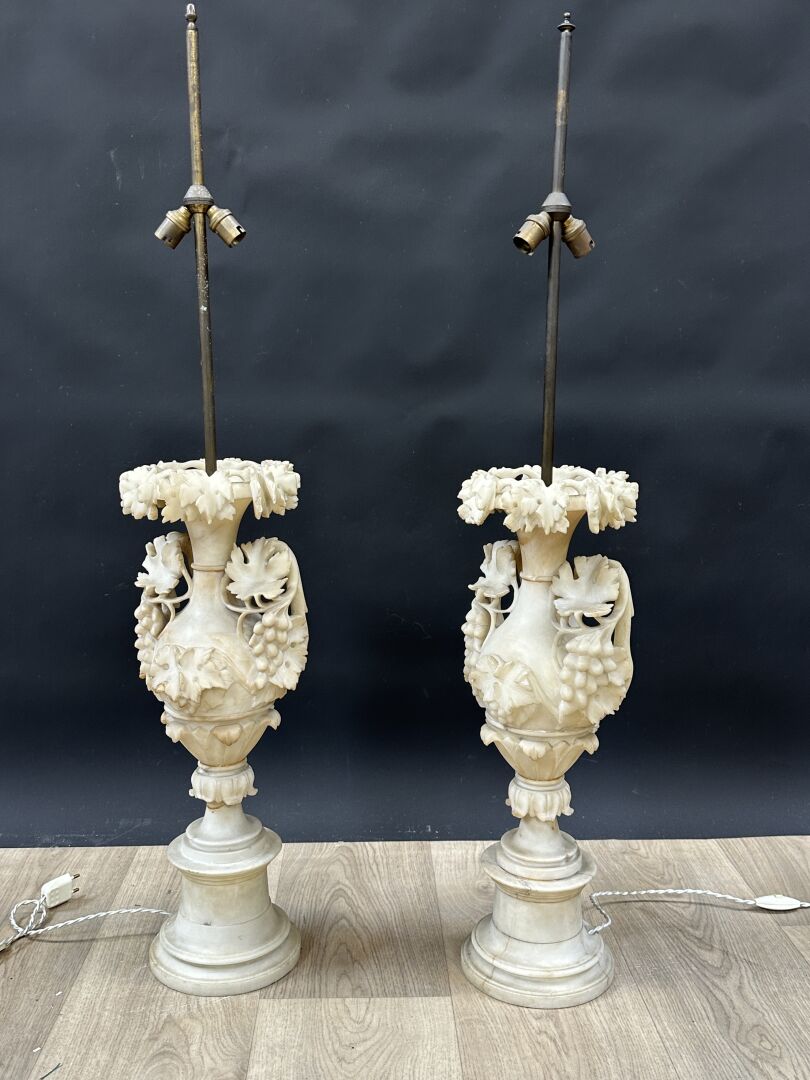 Paire d’urnes en albâtre à décor de pampres de vignes et grappes de raisins, montées en...