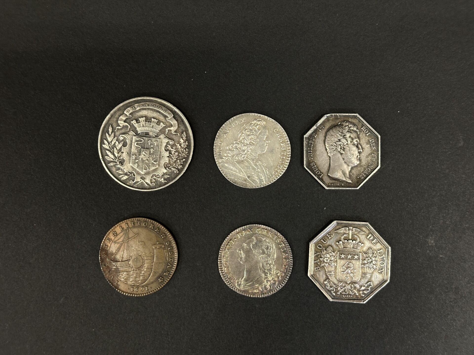 Ensemble de 5 jetons français en argent : Ville de Rouen, Banque de Lyon, Enseignement du Chant,...