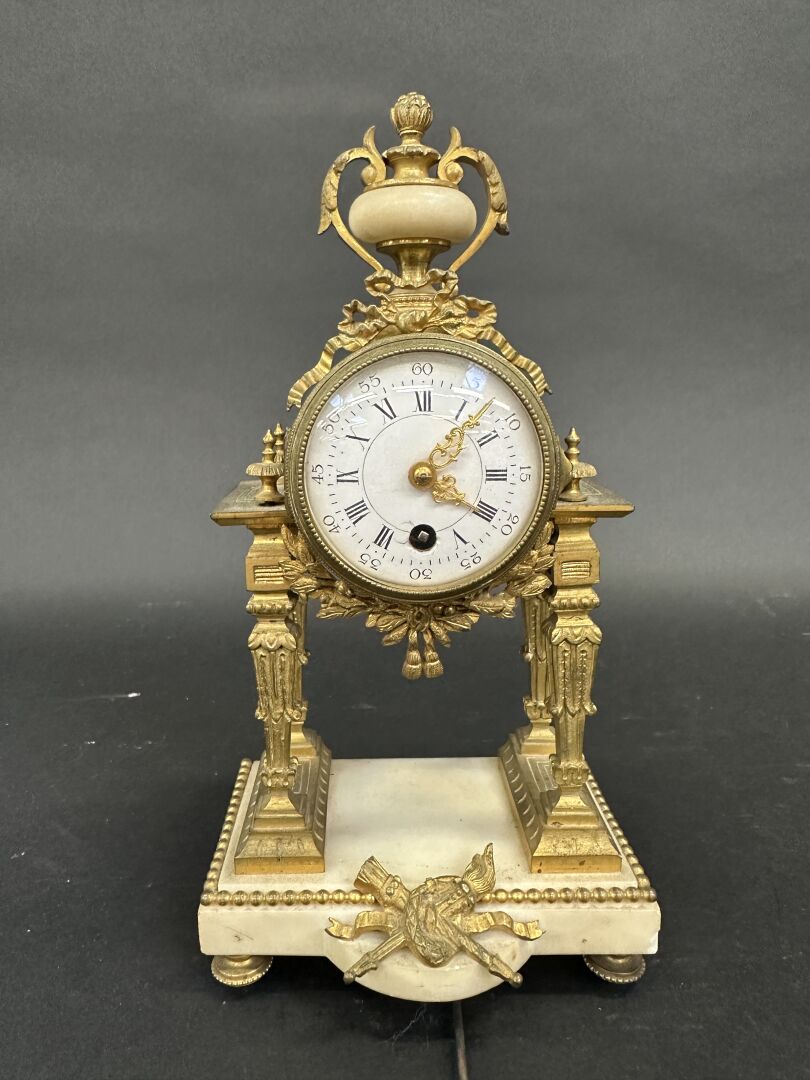 Pendule portique en marbre et bronze doré surmonté d’un pot à feu. Le cadran émaillé...