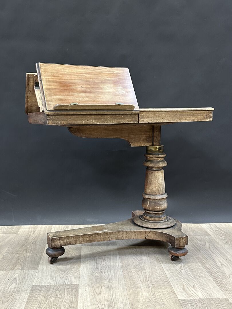 Table de malade en bois verni, le plateau à crémaillère s’ouvre à deux lutrins en face...