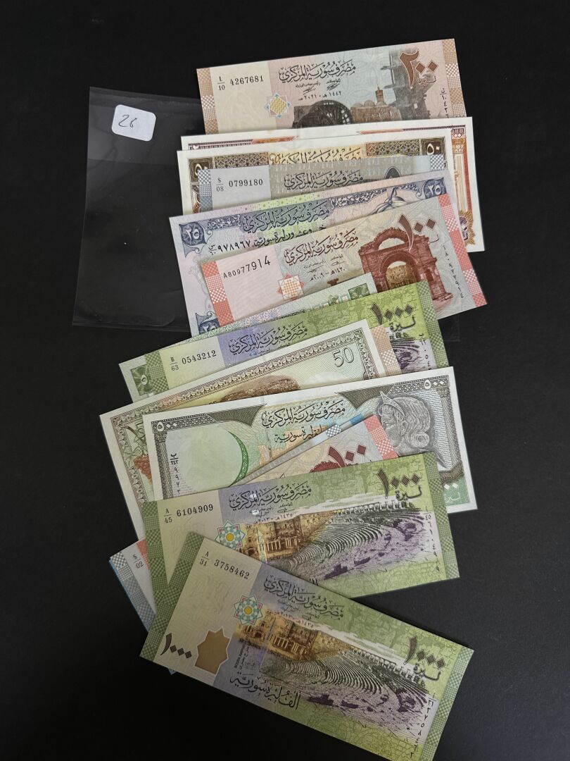 16 billets syriens en belle qualité : 5 Livres, 25 Livres, 50 Livres x 4, 100 Livres x 2, 200...