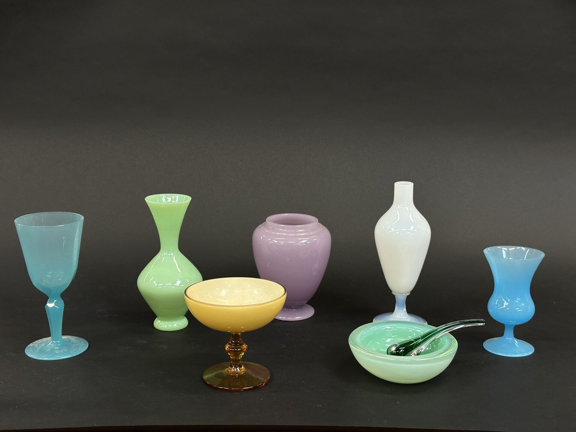 Réunion de sept coupes, verres ou vases en verre ou opaline dont un vase balustre BACCARAT et...