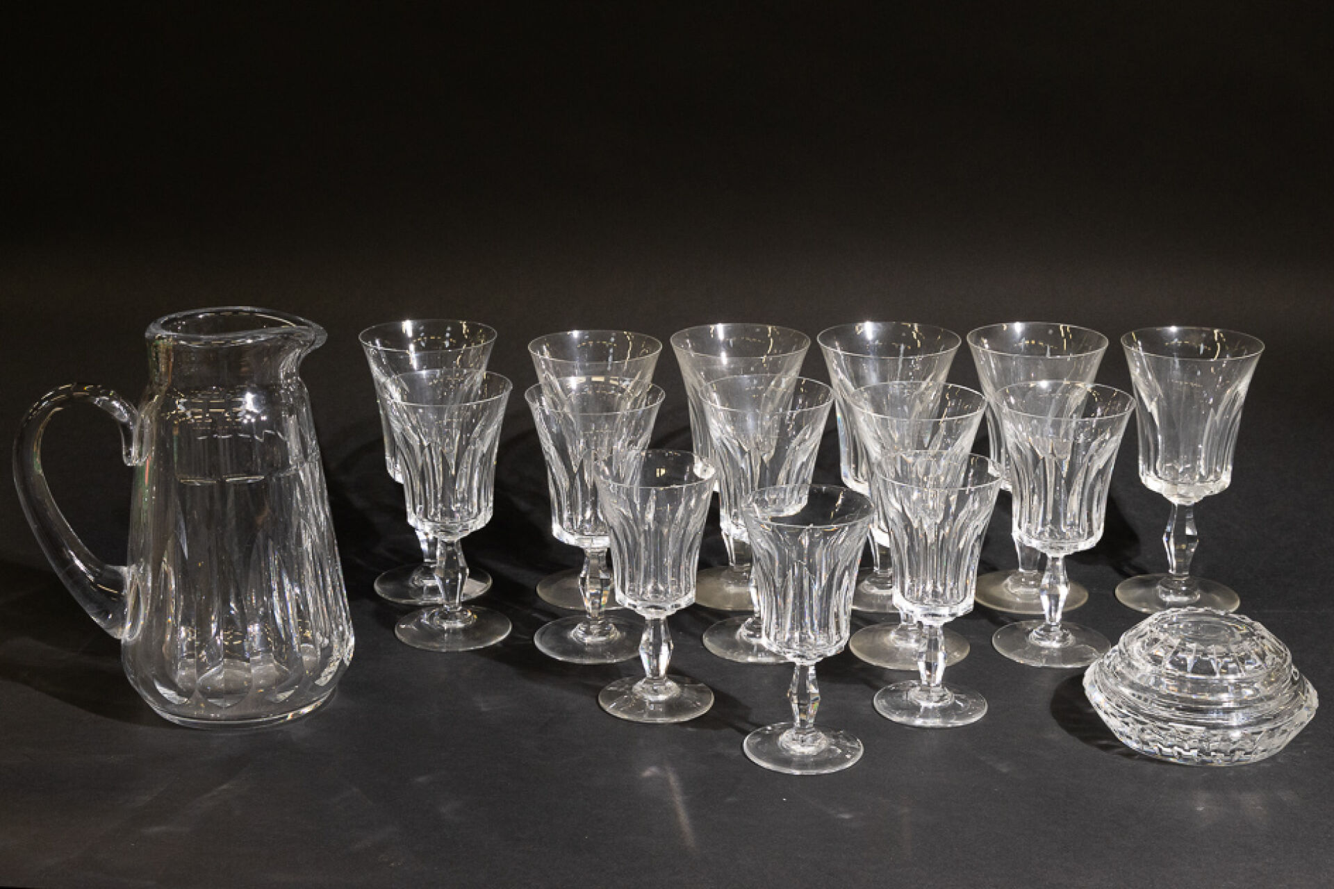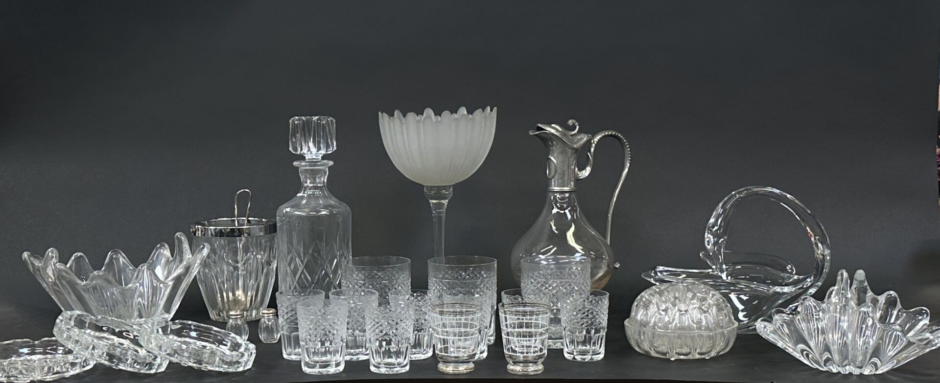 Réunion de verreries comprenant vases, verres, carafes, pique-fleurs, coupes dont une coupe...
