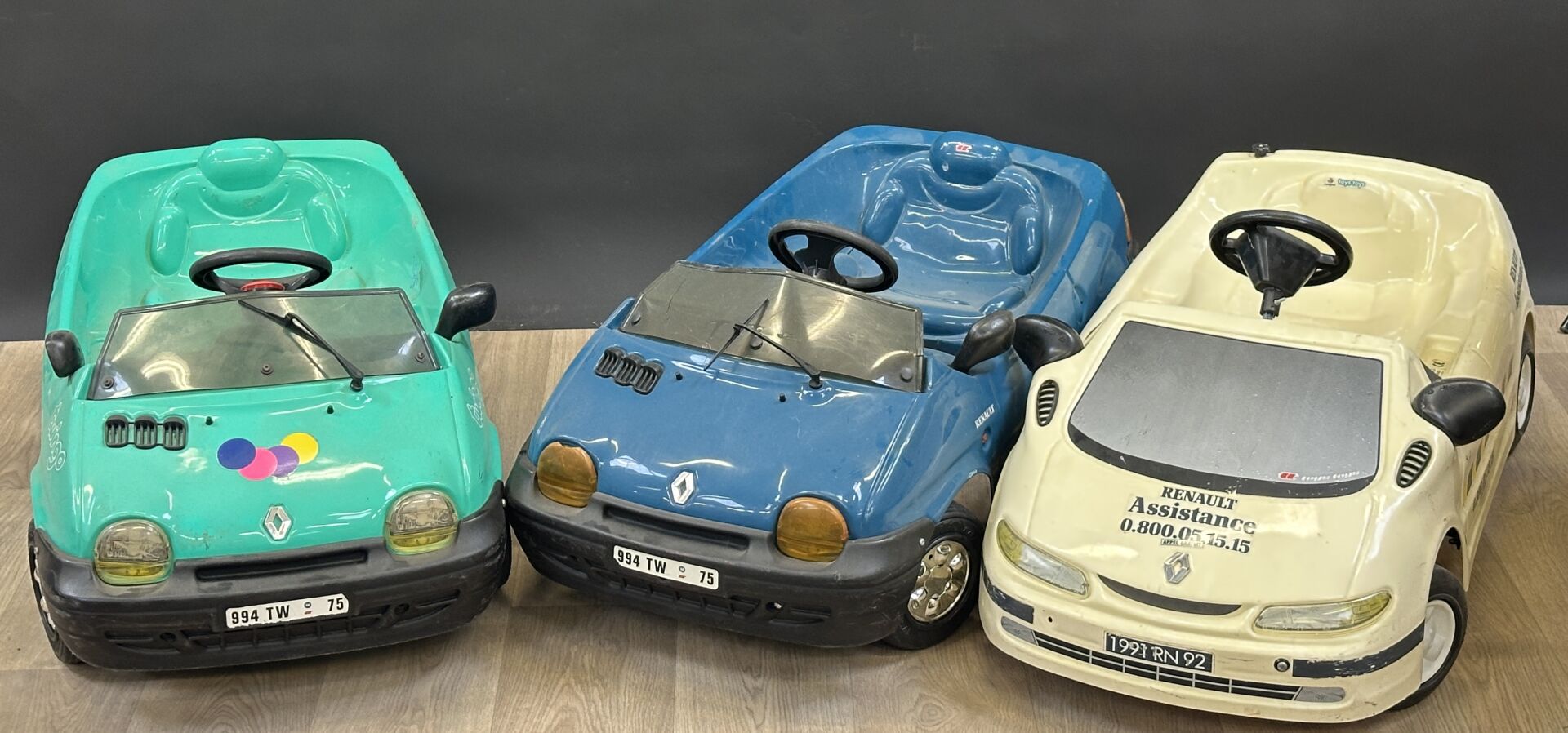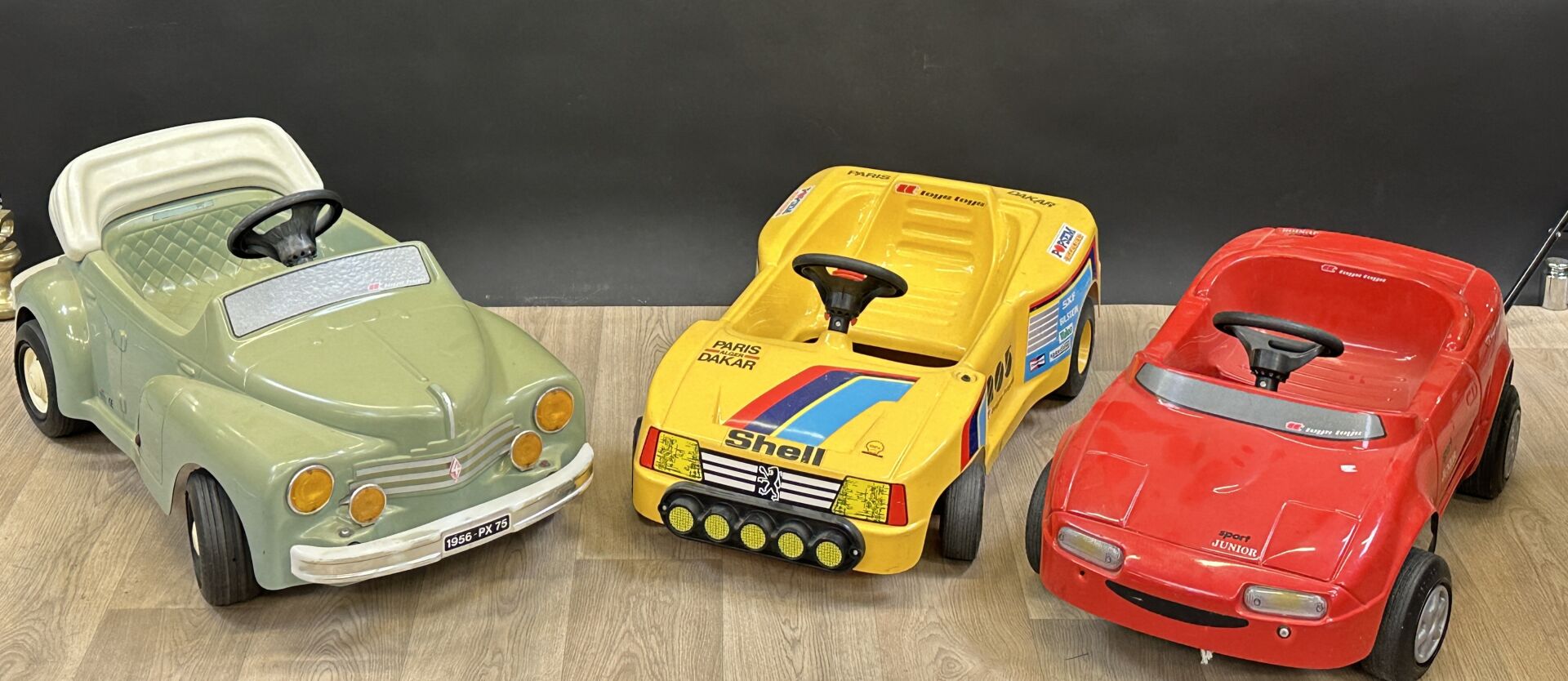 Réunion de quatre voitures à pédales en plastique (accidents et manques) :