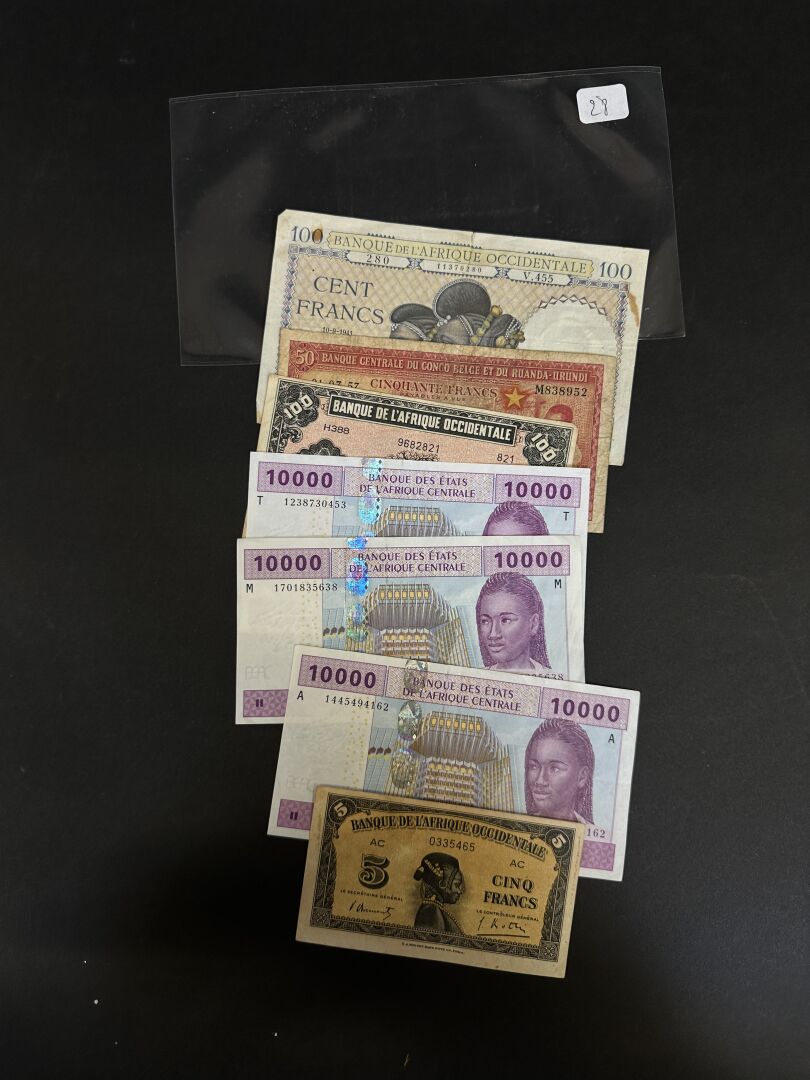 6 billets africains : 50 Francs 1957 (Banque Centrale du Congo Belge et Ruanda-Urundi), 5 Francs...