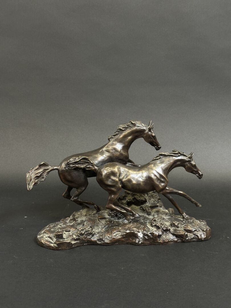 Pendule borne en métal et bronze à patine brune et dorée surmontée d’un lévrier...