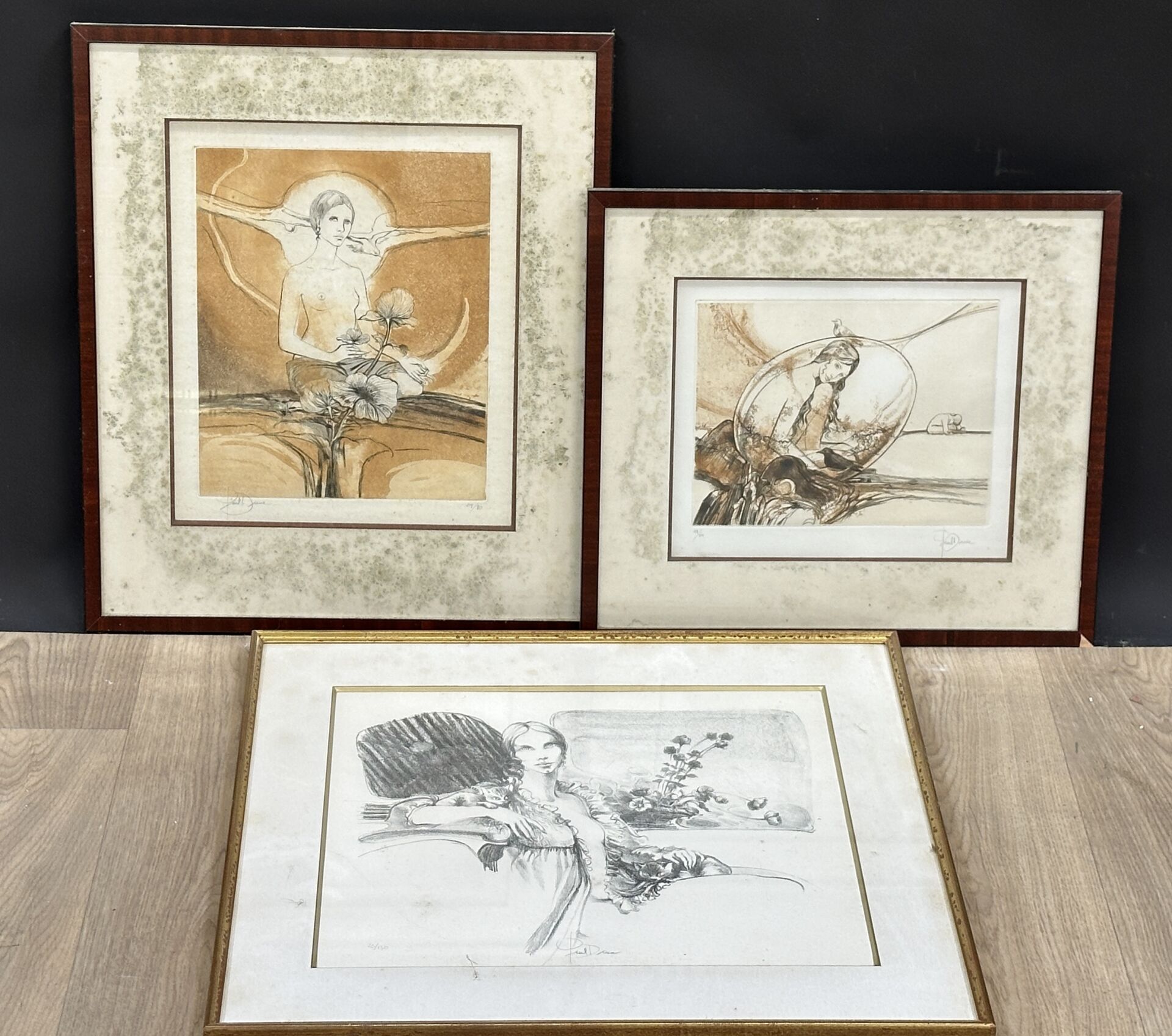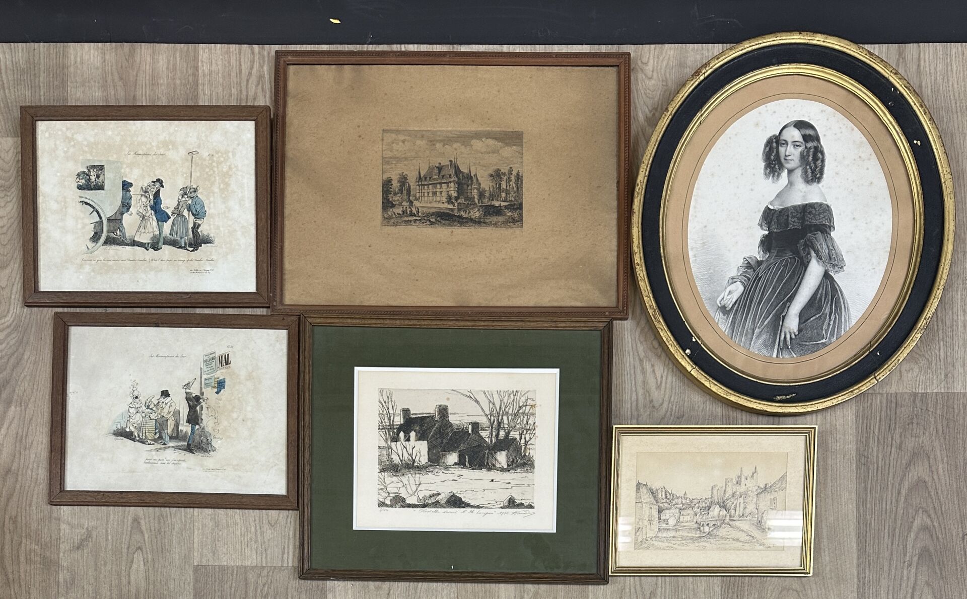 Réunion de six gravures et pièces encadrées dont Portrait de femme deuxième moitié du XIXe...